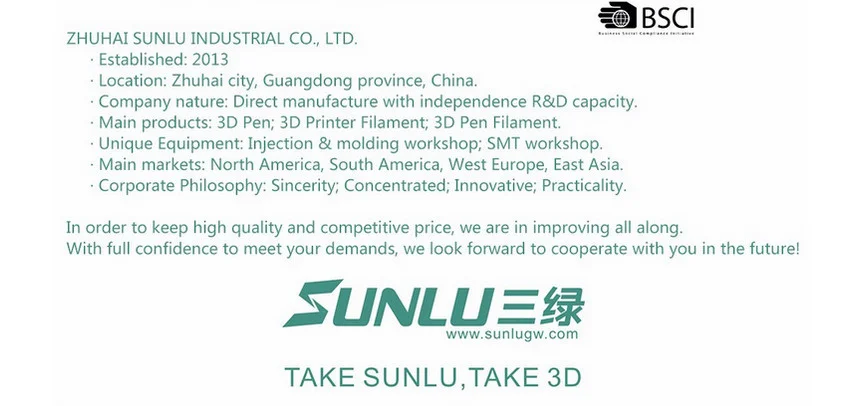SUNLU-это прямая фабрика с BSCI. Расположен в Чжухай, провинция Гуандун.