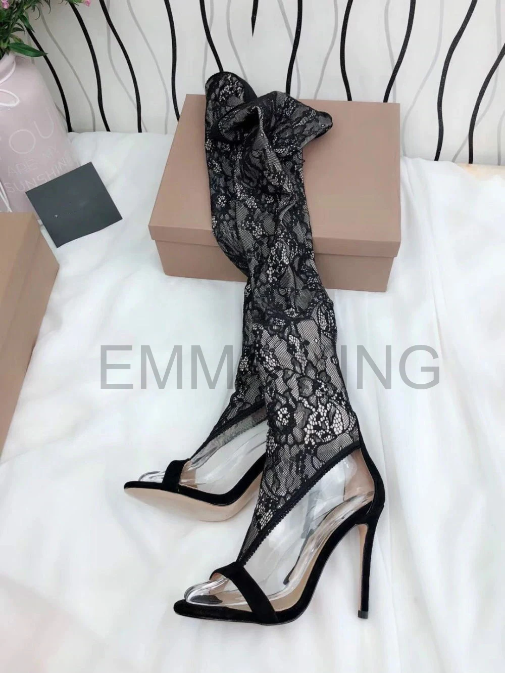 Nazwa marki: EMMA KING Материал верха: Кружево Высота обуви: выше колена Тип каблука: тонкий каблук Форма Носка: открытый носок Высота каблука: очень высокий (8 см-вверх) Размер: Соответствует размеру, выбирайте свой обычный размер Повод: Свадебные/вечерние/Офисные/Клубные Тип застежки: без застежки Сезон: весна-осень