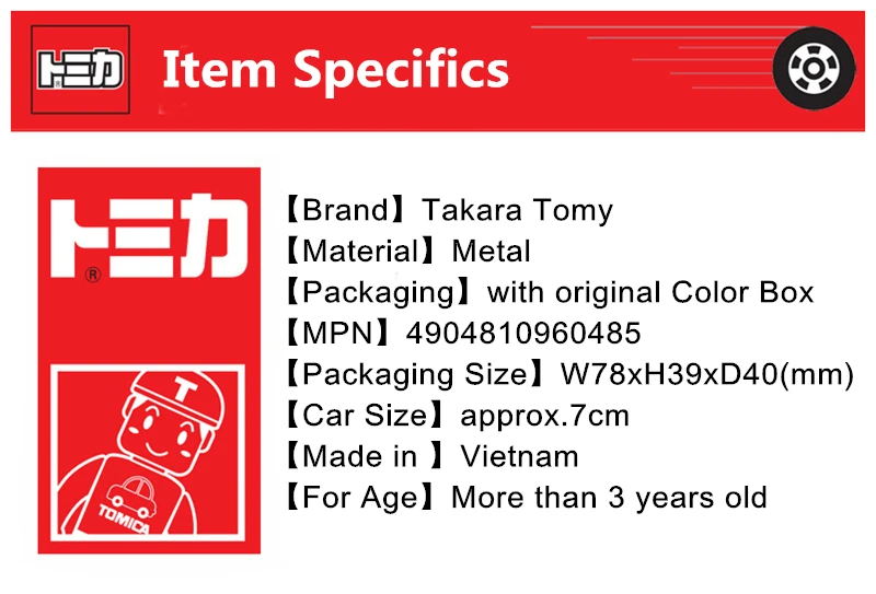 Номер товара. : 4904810960485 Производитель: TAKARATOMY Бренд: Tomica Размер посылка: W78 x H41 x D39 мм Целевой возраст: 3 года ~
