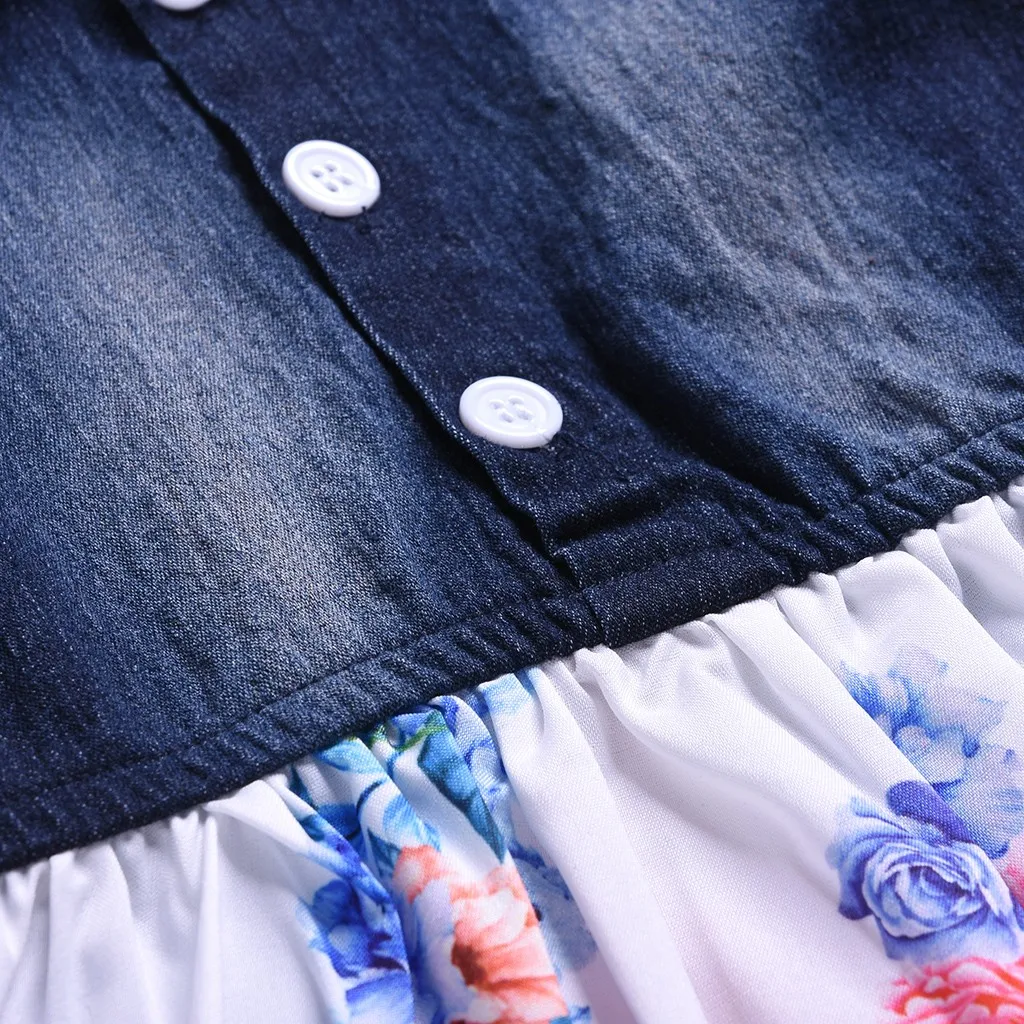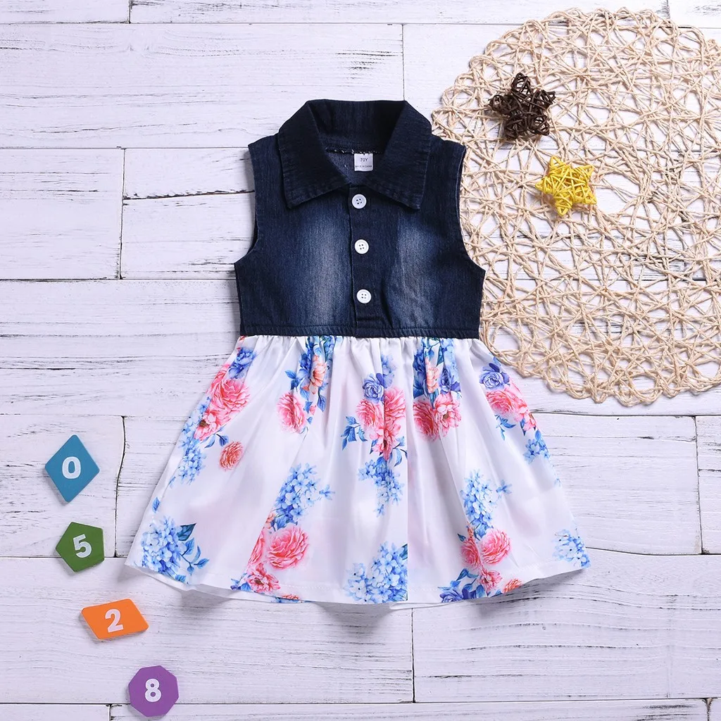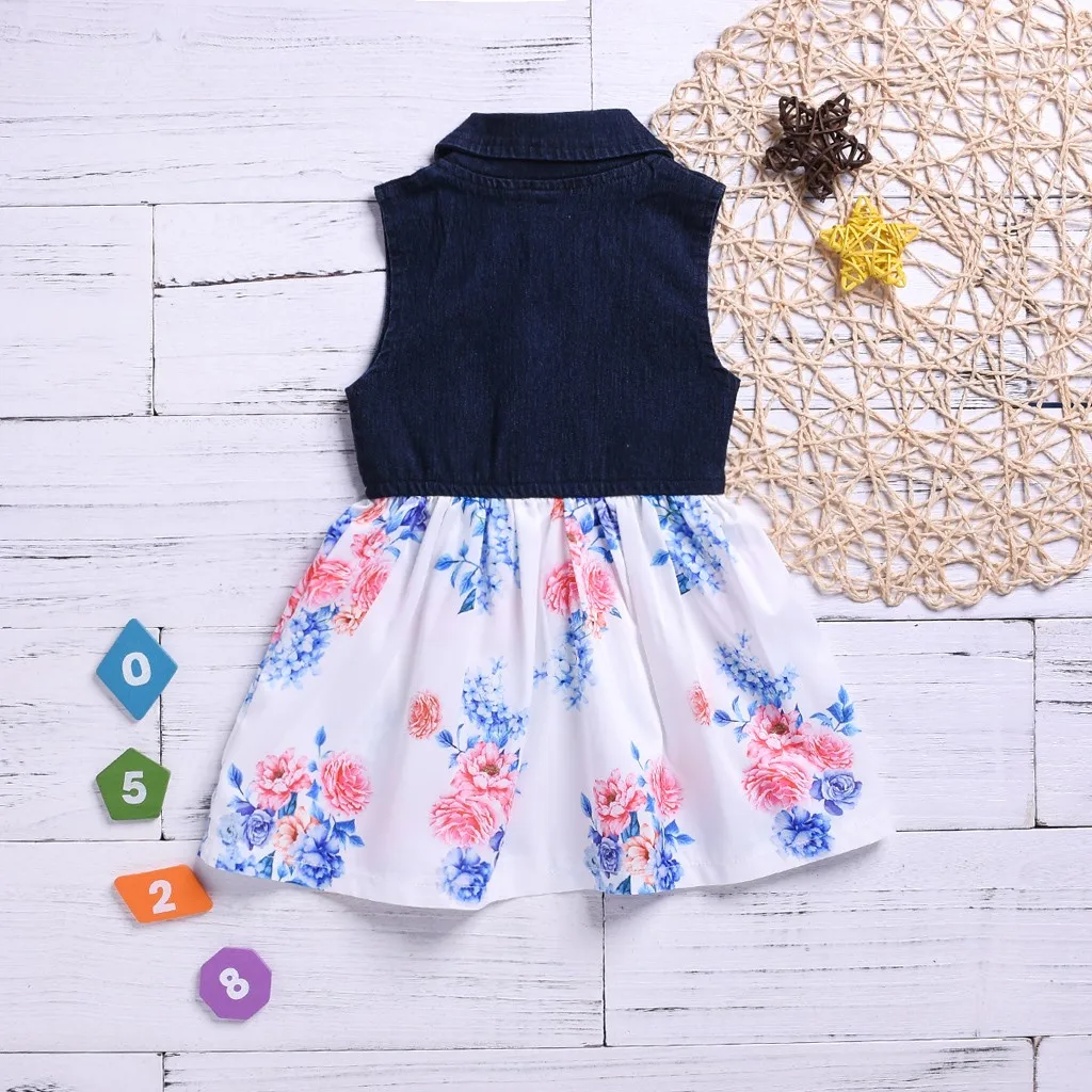 Джинсовое платье принцессы с цветочным принтом для маленьких девочек; одежда с юбкой Обратите внимание: если ваш ребенок пухленький, мы рекомендуем выбрать больший размер, спасибо.