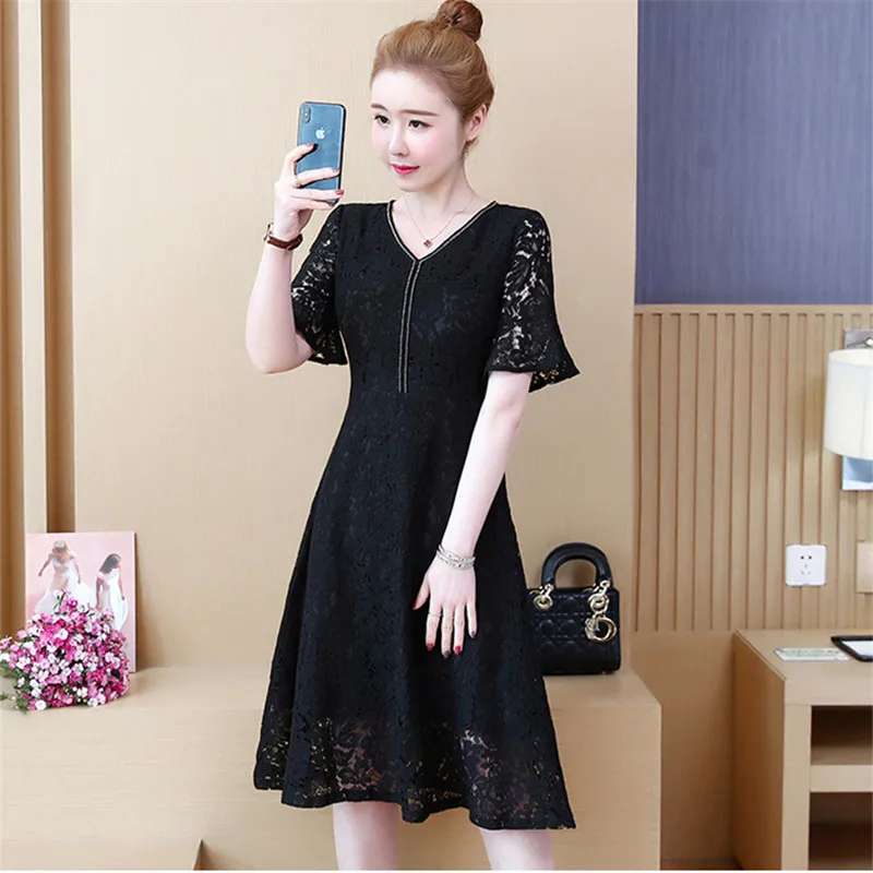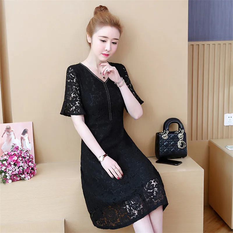 Летнее женское платье 2019 Новое полое с v-образным вырезом женское платье большого размера свободная Труба рукава женское кружевное платье Qw097