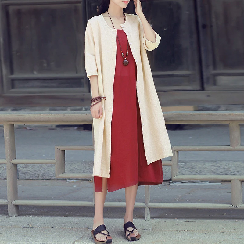 Свободная длинная рубашка в винтажном повседневном стиле. Материал: хлопковая ткань, круглый вырез, плечи и рукава три четверти. Другие особенности включают в себя боковые карманы и Боковой разрез снизу. Это длинная рубашка, пальто-кардиган или платье-рубашка для повседневной носки и праздников.