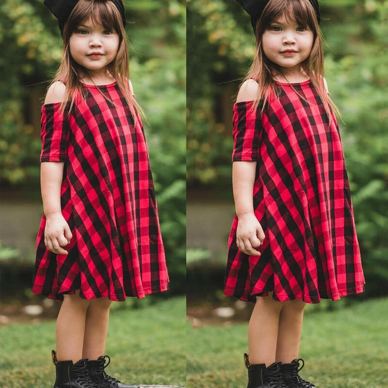 Красные платья в шотландскую клетку для маленьких девочек летнее хлопковое повседневное праздничное платье до колена с открытыми плечами на возраст от 1 года до 6 лет