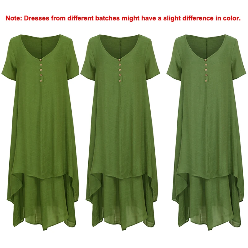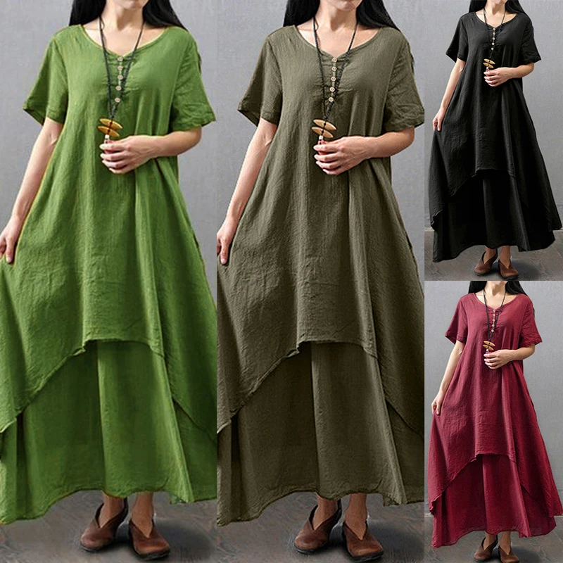 Это свободное, длинное платье в стиле бохо станет чем-то особенным в этом сезоне. Он подчеркивает V-образный вырез с декоративными пуговицами внизу, короткими рукавами и асимметричным многослойным подолом, делая его немного шикарным. Идеально подходит для сочетания с ожерельем в этническом стиле.