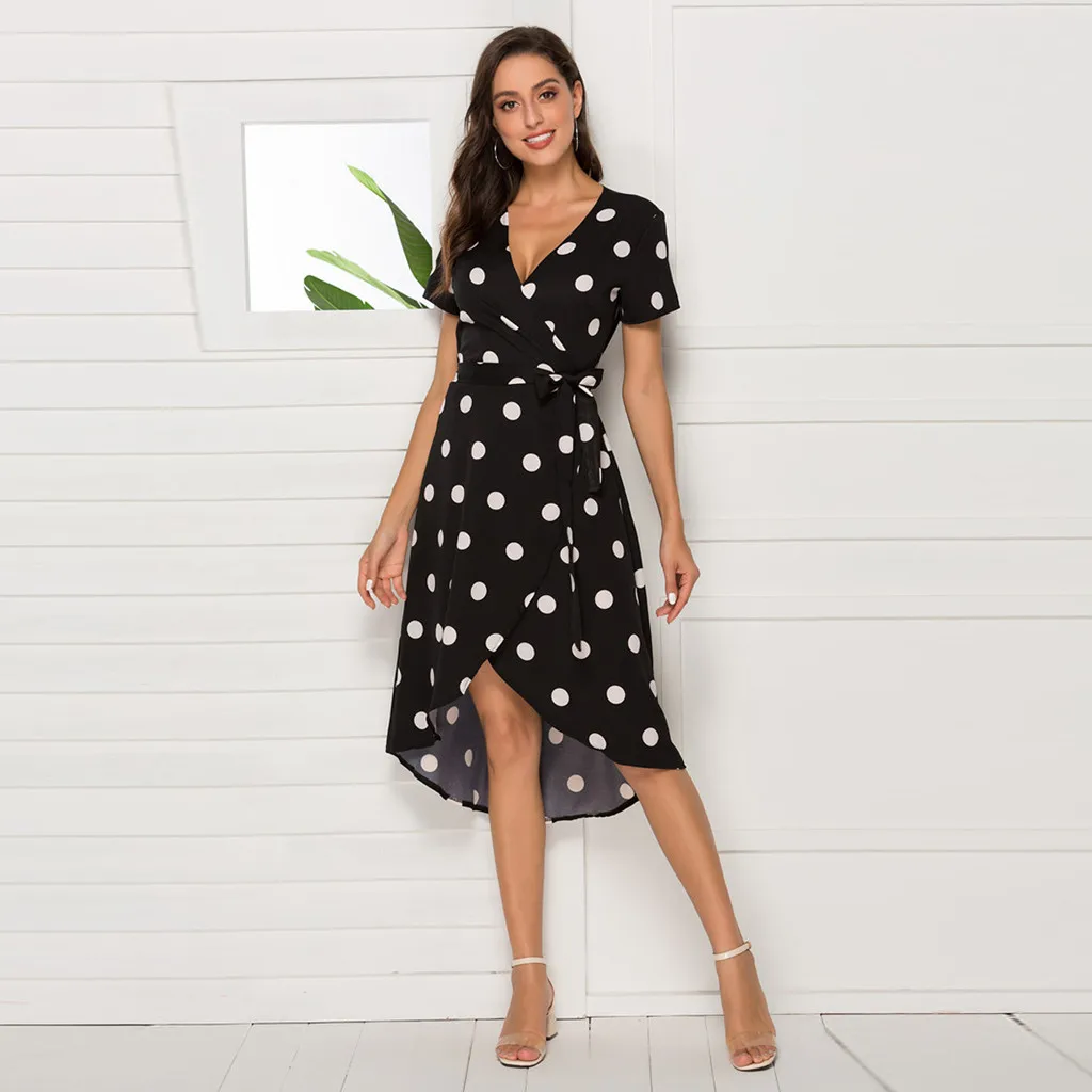 Летнее женское модное Повседневное Платье До Колена в горошек с поясом и v-образным вырезом
