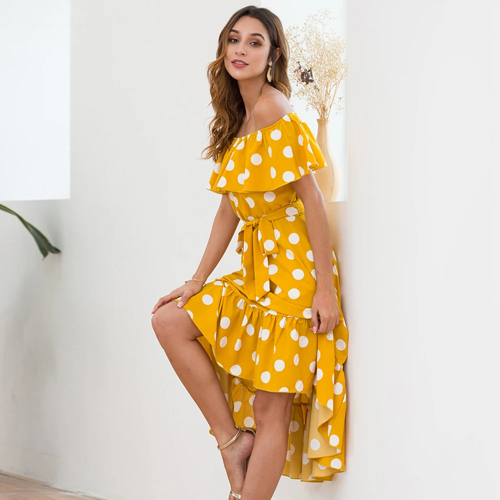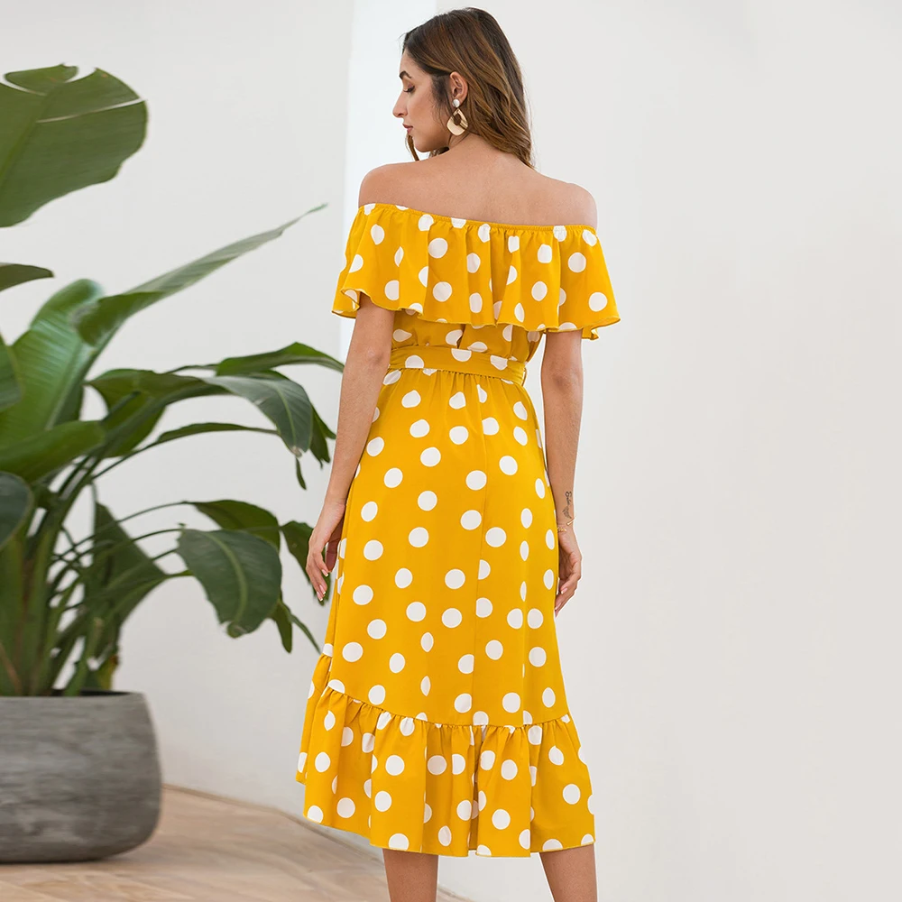 * Описание товара: женское летнее платье в горошек с вырезом лодочкой на шнуровке, желтое модное платье миди с оборками