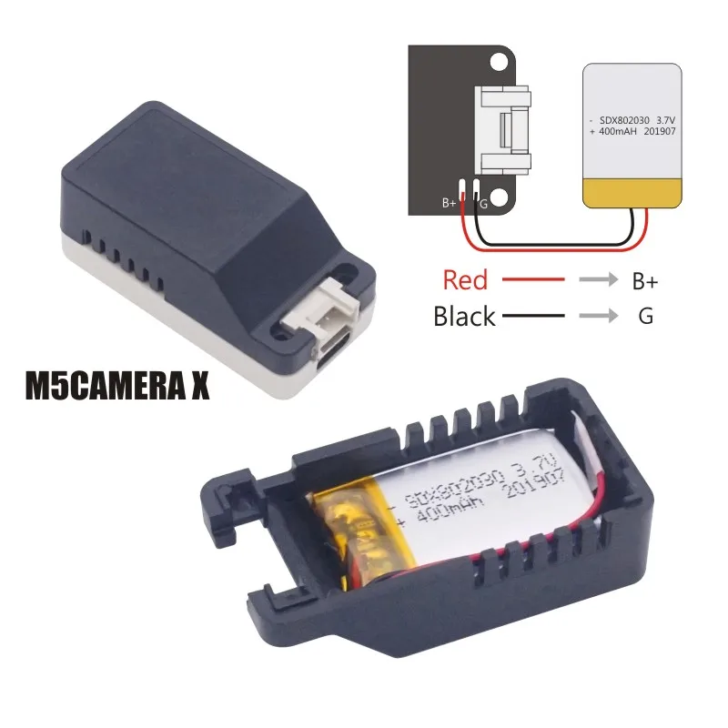 Это Батарейная база для 3 типов камер M5Camera: M5Camera, M5Camera_X, M5Camera_F. Это аккумулятор Lipo емкостью 400 мАч. Вы можете подключить его к интерфейсу батареи на плате камеры m5. Обратите внимание на полярность. Вы можете получить дополнительный источник питания для камеры m5. # Красный (положительный) # Черный (отрицательный)