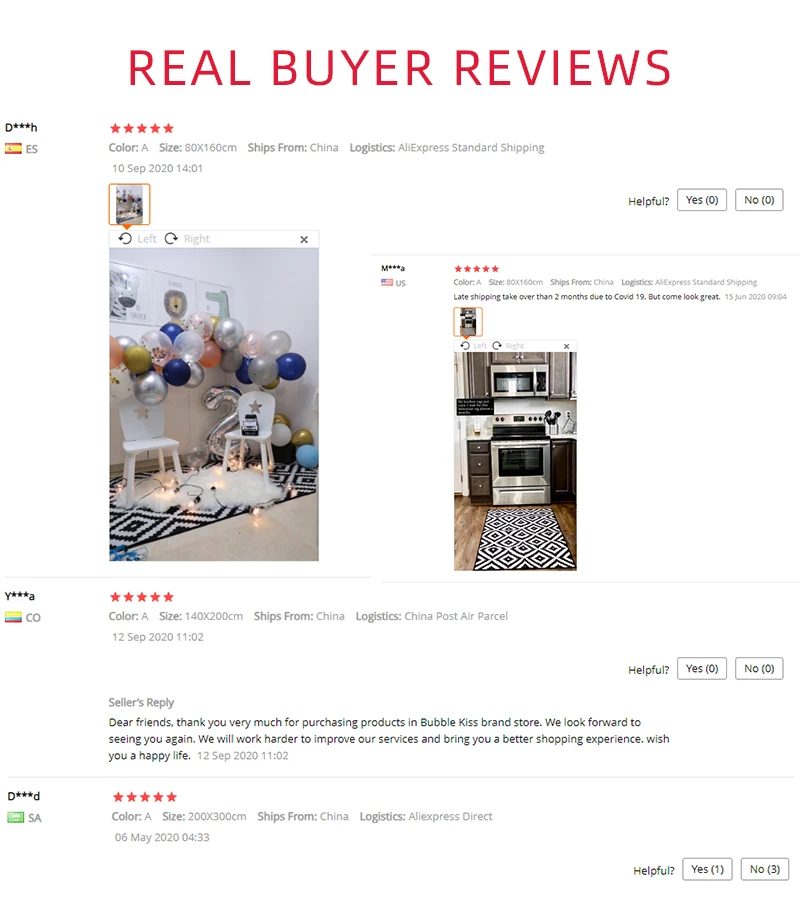 В: есть ли у вас реальные фотографии? Могу ли я посмотреть? О: Да. У нас есть. Я отправлю вам Настоящее фото позже. В: это противоскользящее изделие? О: Да, нижняя часть ковра-Нескользящая пластиковая подошва. В: если вам это не нравится, как вернуть товар? О: мы вернем покупателям деньги, если покупатели возвращают товары в течение 15 дней с момента получения покупателями товаров по любой причине. Тем не менее, покупатели должны нести стоимость обратной доставки и убедиться, что возвращенные товары находятся в их первоначальном состоянии. В: как чистить ковер? О: небольшие ковры можно стирать в стиральной машине или стирать вручную. Большие ковры рекомендуется чистить с помощью пылесоса. Вопрос: Что делать, если вы хотите большой ковер? О: пожалуйста, свяжитесь с нашей службой поддержки клиентов напрямую. В: какая логистика используется для доставки? О: товары отправляются стандартной доставкой AliExpress, авиапочтой Китая, Премиум доставкой AliExpress, ePacket, доставляются в большинство стран в течение 15-35 рабочих дней. Время доставки зависит от пункта назначения и других факторов, это может занять до 60 рабочих дней. Если вы хотите получить товар быстрее, пожалуйста, свяжитесь с нами, чтобы оплатить дополнительные перевозки, мы можем предложить вам следующие более быстрые и дешевые способы доставки: UPS , DHL , Fedex , TNT , DEPX , EMS. С помощью этих способов вы можете получить товар в течение 5-7 рабочих дней.