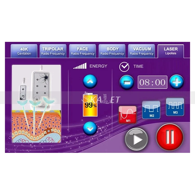 Remove fine wrinkle and smooth shrink pore Lymphatic drainage, promoting metabolism and blood circulation Contour and repair post-pregnancy scarLaser Slimming:Laser emits low levels of laser energy and it creates a chemical signal in the fat cells that breaking down the store triglycerides into fatty acids, glycerol and water molecules. Then, these substances will transport through the body by lymphatic systems to supply the body with energy. A period of laser treatment will complete the metabolism of fat acids and then the fat cell will be smaller to achieve body shaping.Radio Frequency:Radio frequency is one kind of high frequency electromagnetic wave, it can penetrate the dermis and subcutaneous tissue to heat collagen in the dermis layer, collagen in the dermis layer will shrink immediately after the temperature rise and proliferation of new collagen, so as to achieve skin rejuvenation and tightening, pigment improvement etc.Advantages:Ultrasonic 40KHZ is recognized as most power cavitation system Combination of laser liposuction and cavitation make slimming period much shorter. Combination of red light and RF can accelerate tissue coagulation to avoid muscle slacking after slimming Non-invasive, non-surgical and without anesthesia No risk of rebound and no side effect