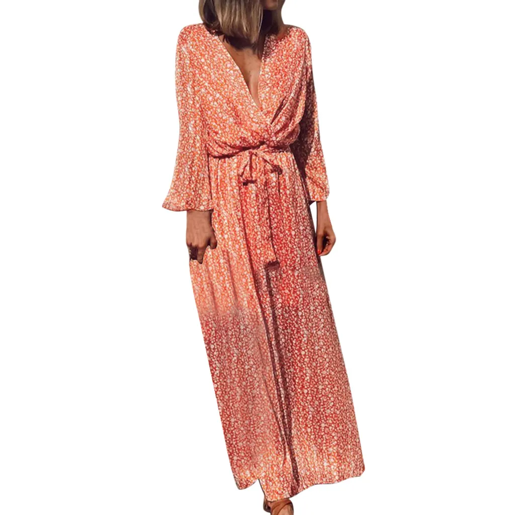 Женское богемное длинное платье, летнее Бандажное платье с расклешенными рукавами, с перекрестным v-образным вырезом, платья длиной до лодыжки, Пляжное Платье макси с бантом, большие размеры 5XL