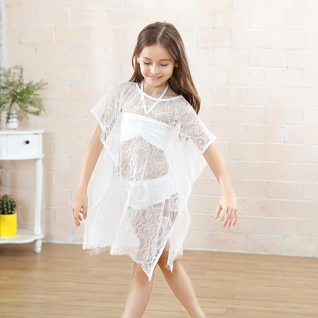 Детский комплект бикини для девочек, пляжный топ + шорты + кружевная шаль, купальный костюм