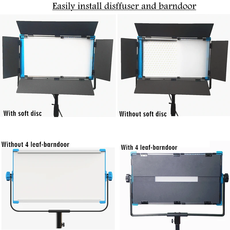 В комплекте в посылка Диффузор, адаптер переменного тока, 4-створчатая шторки Дополнительно для того, чтобы купить V-mount батарея, сумка для переноски, штатив(Не входит в комплект)Особенности: