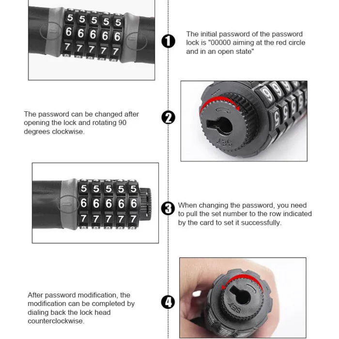 5. Код пропуска по умолчанию для цепного замка составляет "00000". Чтобы установить новую 5-значную комбинацию, вы открываете замок, затем поворачиваете внутренний Циферблат на 1/4 оборота, устанавливаете новую комбинацию, затем поворачиваете внутренний циферблат в вертикальном положении, что устанавливает новый комбинированный код.