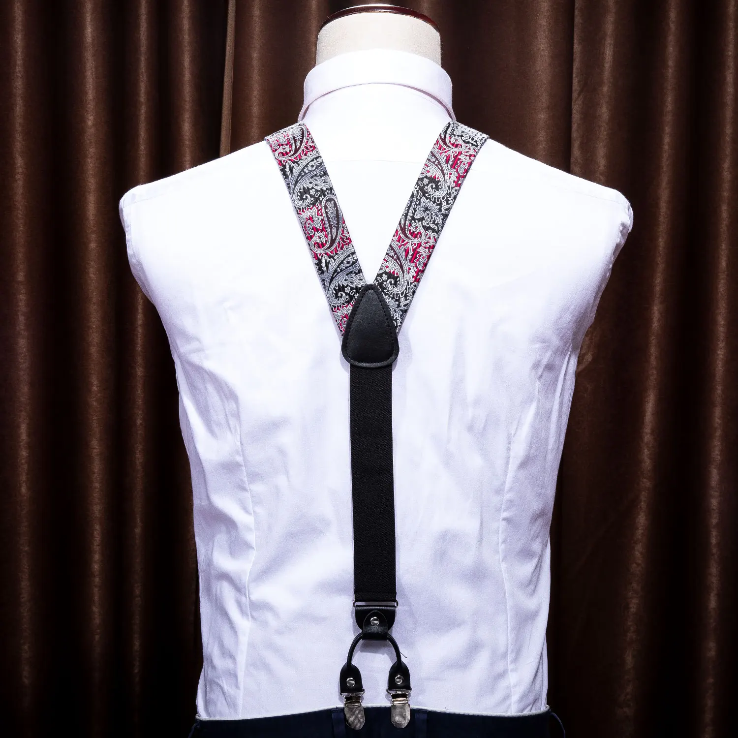 Для мужчин красная рубашка на подтяжках с рисунком Пейсли черный галстук-бабочка Hanky набор тканый y-образный Шелковый подтяжки без застежек серебряные клипсы Barry.Wang BB-2002
