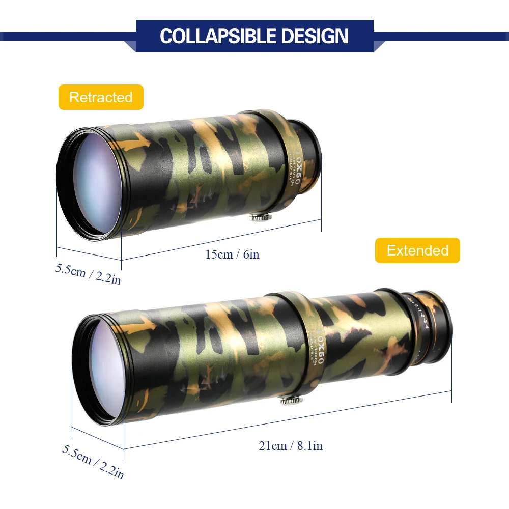 Это мини-телескоп с 10x мощным увеличением, чтобы предложить 10x более близкий и более яркий вид через 50 мм объектив с высокой четкостью. Он измеряет только 3 дюйма, когда убирается, а затем удлиняется до 6 дюймов полной длины. Складная конструкция делает его компактным и удобным для переноски в кармане, отлично подходит для катания на лодках, спортивных мероприятий, наблюдения за птицами, скачек, охоты, пляжа, путешествий, концертов и других видов активного отдыха.