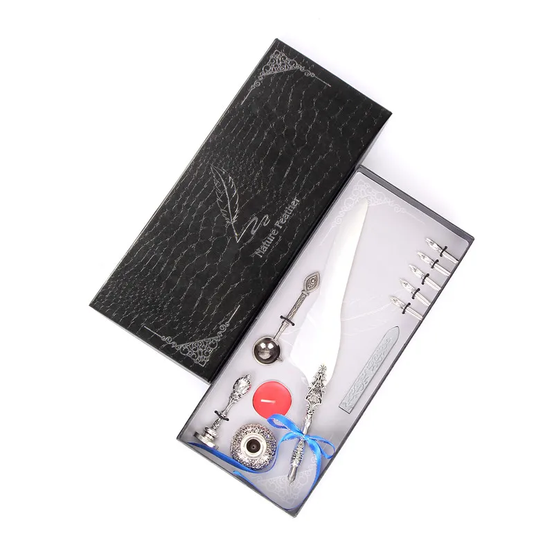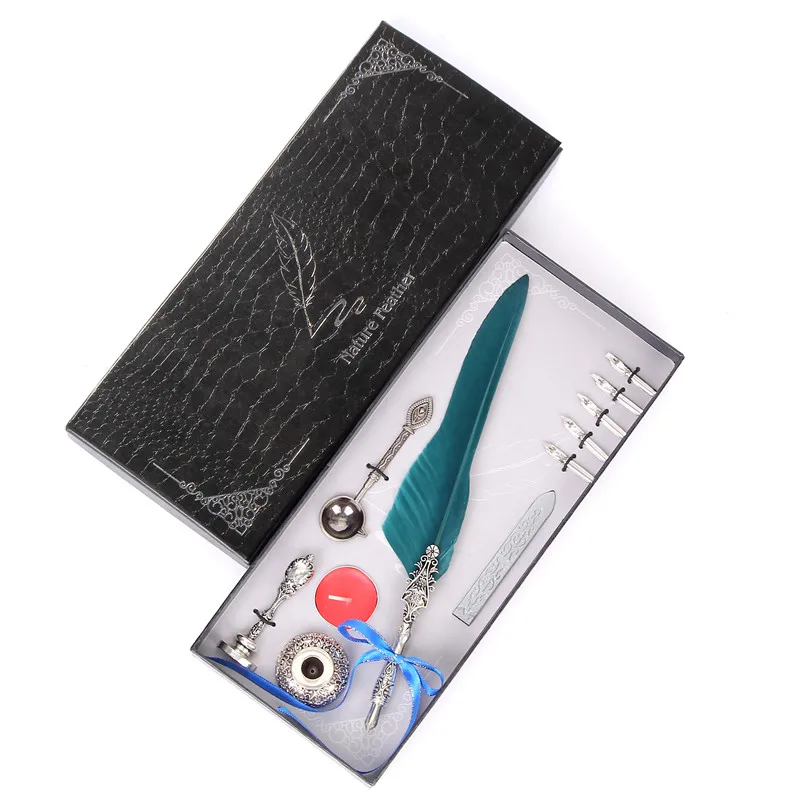 DescriptionRetro Vintage Calligraphic Feather Pen Writing Pen Stationery Gift Box Wedding Birthday Gift feature: 1. Easy to use, high quality nib, made of stainless steel for smooth writing. 2. Vintage texture copper pen holder, simple, gentleman, smooth body, feel very good. 3. Gift box packaging, suitable for sending couples, sending old people, sending teachers. Product specifications: Color: ten colors to choose from Product size: feather pen size: 25-26cm /9.8in-10.2in gift box package size: 30cm × 13cm × 4cm / 11.8in × 5.1in × 1.5in full gift weight: 300g Product material: alloy pen holder + stainless steel nib Packing configuration: one spoon + one stamp + one round wax + one pen holder + one three-color sticker + five replaceable nibs + one feather pen Remarks: 1. The tip of the pen is 1.0mm. Each quill is equipped with five nib models. No. 1 3mm, No. 2 2.5mm, No. 3 2mm, No. 4 1.5mm, No. 5 1mm,