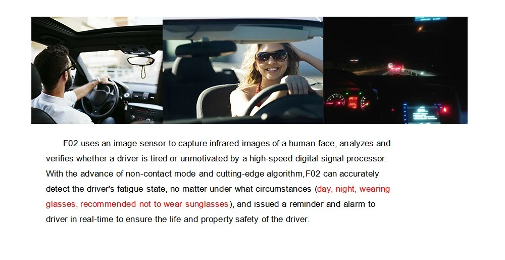 Благодаря передовому бесконтактному режиму и передовому алгоритму устройство предупреждения может точно определить состояние усталости водителя, независимо от того, при каких обстоятельствах (день, ночь, ношение очков, рекомендуется не носить солнцезащитные очки), и выдается напоминание и сигнализация водителю в режиме реального времени, чтобы обеспечить безопасность жизни и собственности водителя