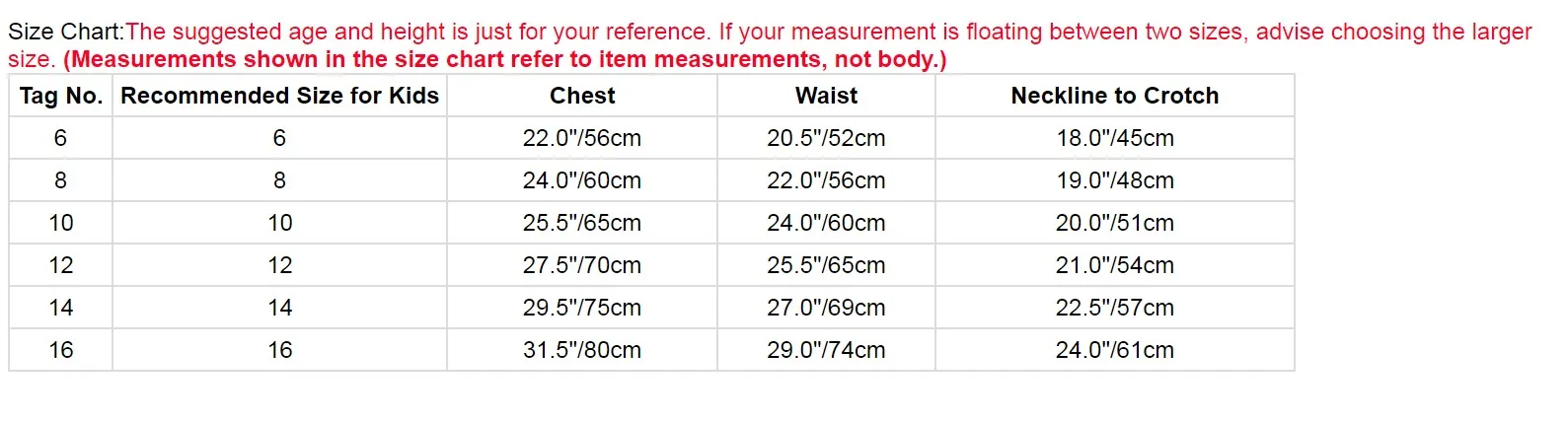Tag No. Recommended Size for Kids Chest Waist Neckline to Crotch 6 6 22.0"/56cm 20.5"/52cm 18.0"/45cm 8 8 24.0"/60cm 22.0"/56cm 19.0"/48cm 10 10 25.5"/65cm 24.0"/60cm 20.0"/51cm 12 12 27.5"/70cm 25.5"/65cm 21.0"/54cm 14 14 29.5"/75cm 27.0"/69cm 22.5"/57cm 16 16 31.5"/80cm 29.0"/74cm 24.0"/61cmFriendly Tips: The size is measured by hands, please allow minor error of measurement. Photo color might be a little different from the actual product due to color display of different monitors.
