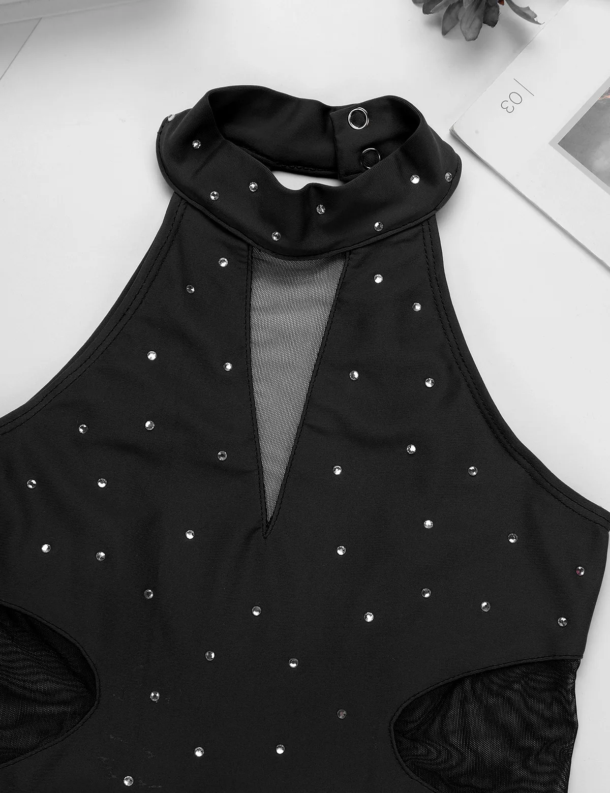 Sleeveless, mock neck with press button closure, decorated with shiny rhinestone detailing. Cutout back.