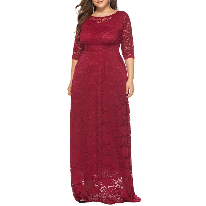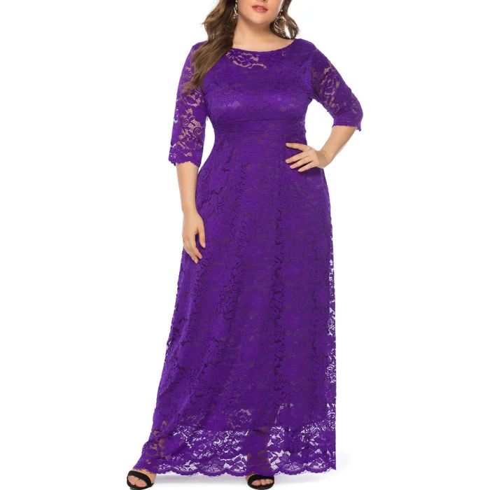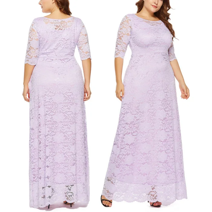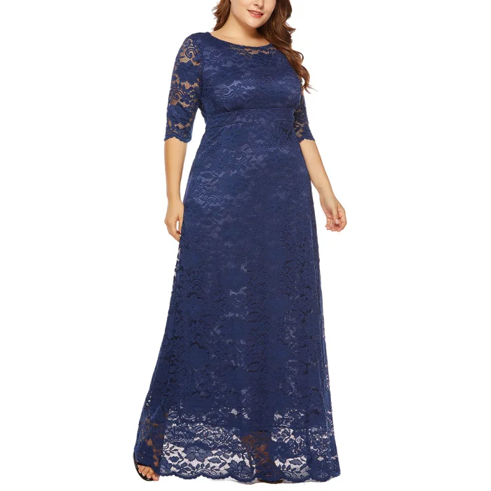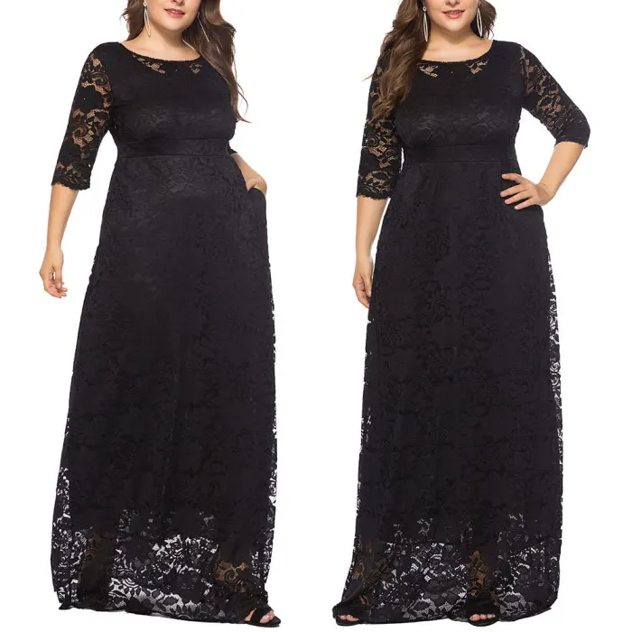 3/4 рукав, длина в пол, округлый вырез размера плюс Макси платье кружевное длинное платье.