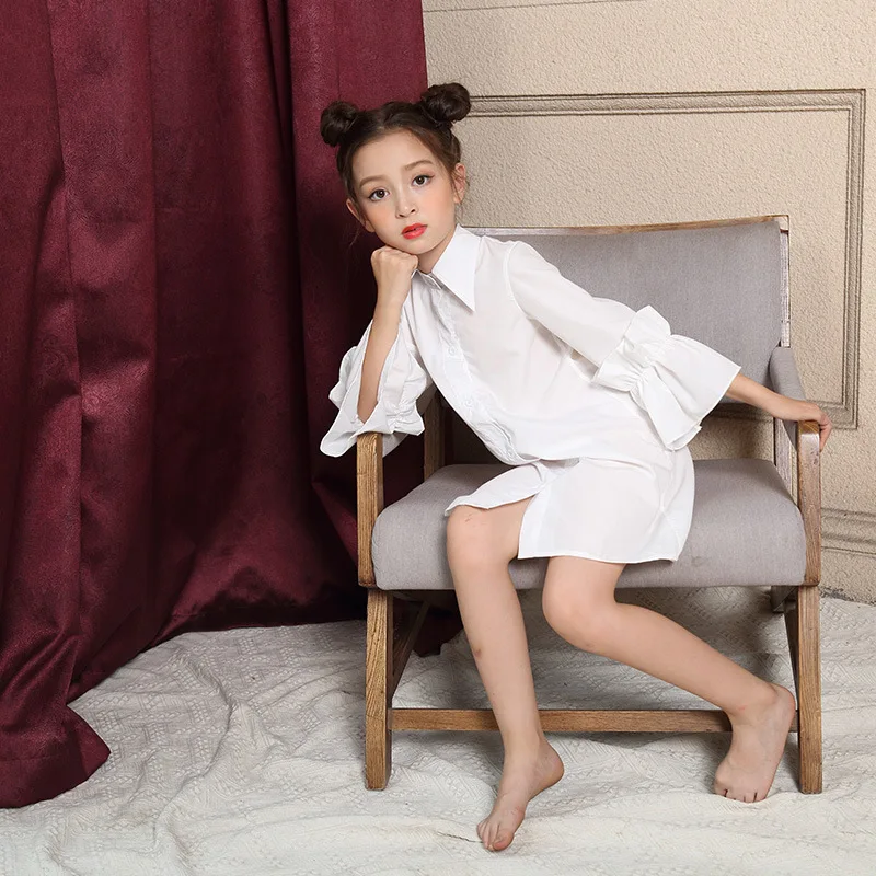 Модель, показанная этой модной белой рубашкой с отложным воротником и расклешенными рукавами, платье для девочек, одежда 2019 г. Новинка: