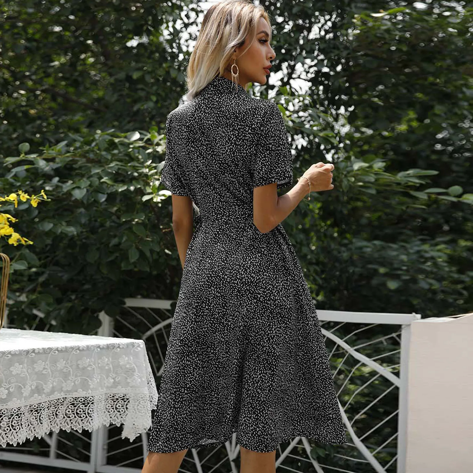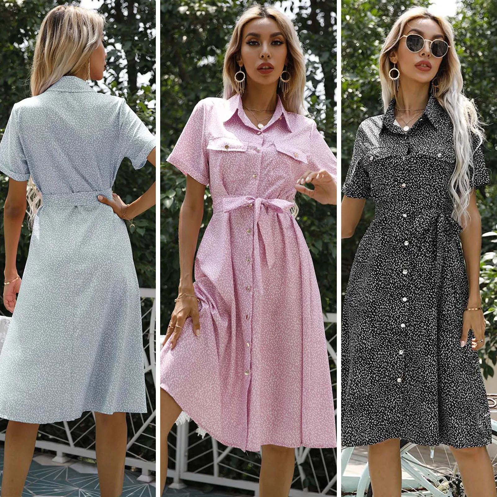 Платье с короткими рукавами и цветочным принтом. К вашим услугам отложной воротник, пуговицы спереди, нагрудные карманы и ремень на талии, Подчеркивающий фигуру. Есть для праздников и улиц.