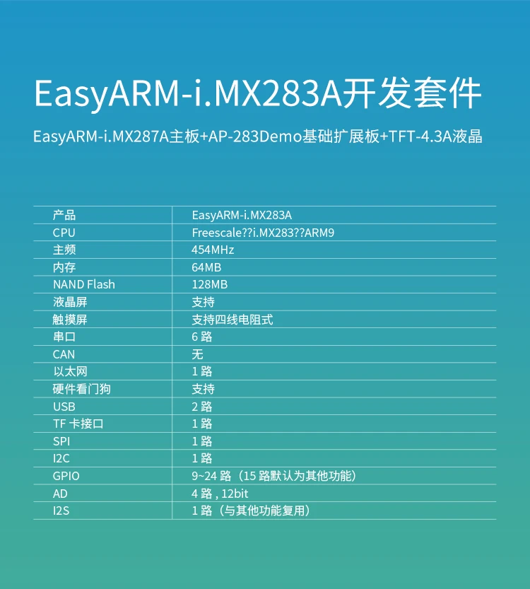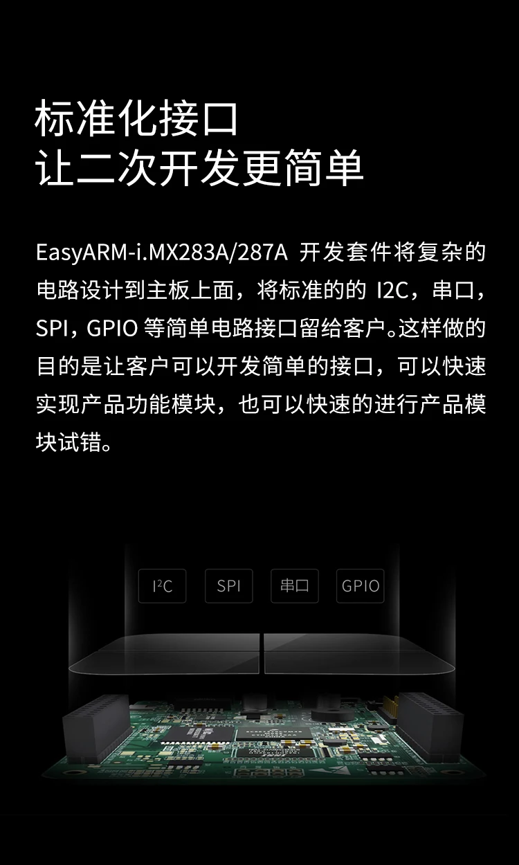 Easyarm-i. mx283a /287A development kit designs complex circuits on the motherboard, leaving the standard 12C, serial port, SPI, GPIO and other simple circuit interfaces to the customer.The purpose of this is to allow customers to develop simple interfaces that can quickly implement product function modules, and to quickly test and error product modules.