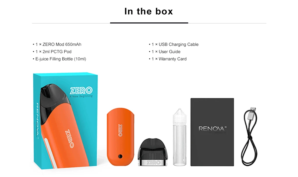1 × ZERO Mod 650 мАч 1 × 2 мл PCTG Pod 1 × бутылка для наполнения E-juice (10 мл) 1 × usb-кабель для зарядки 1 × руководство пользователя 1 × Гарантийный талон Упаковка со склада, упаковка может быть изменена без уведомления.