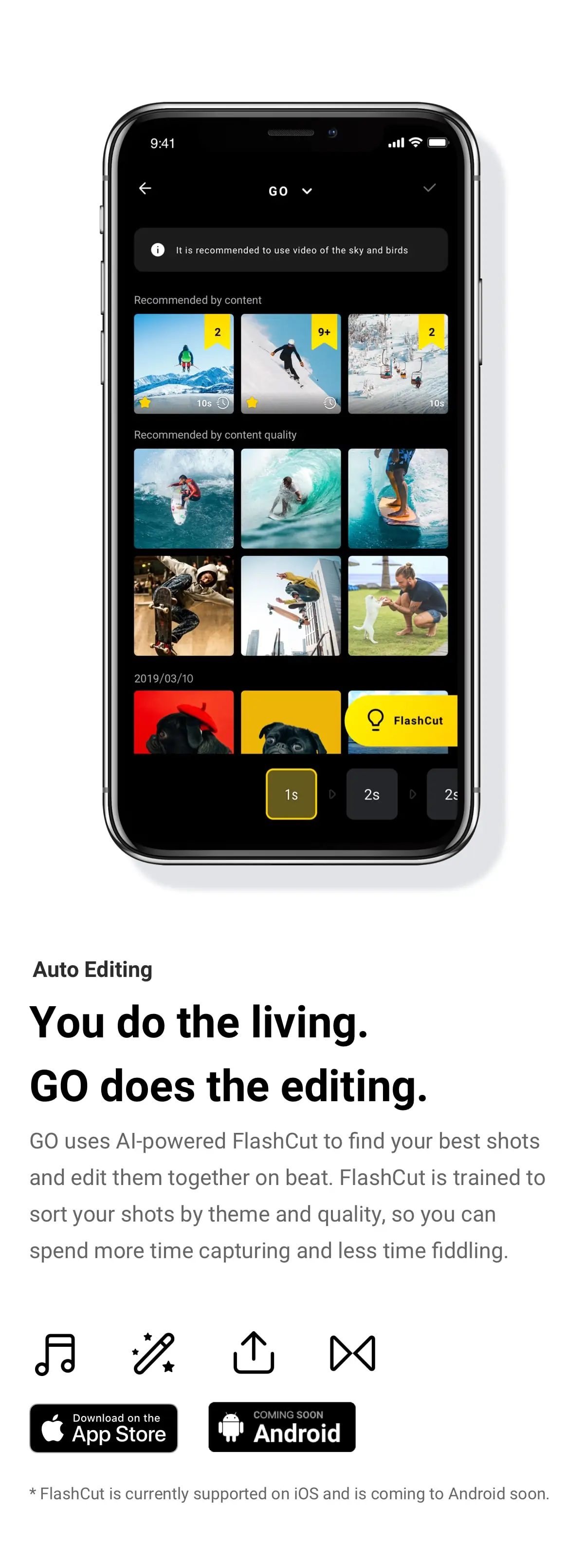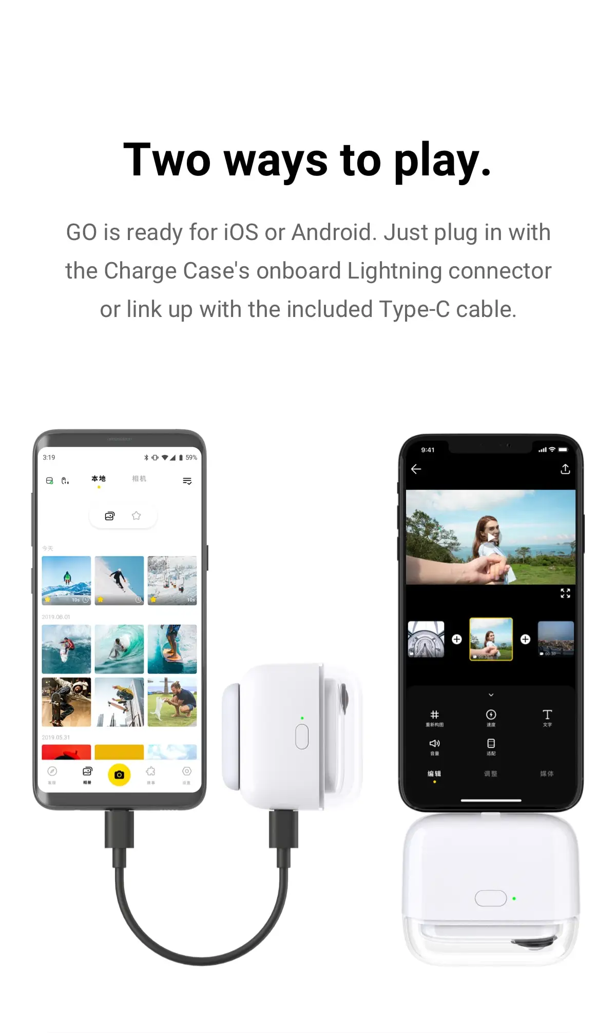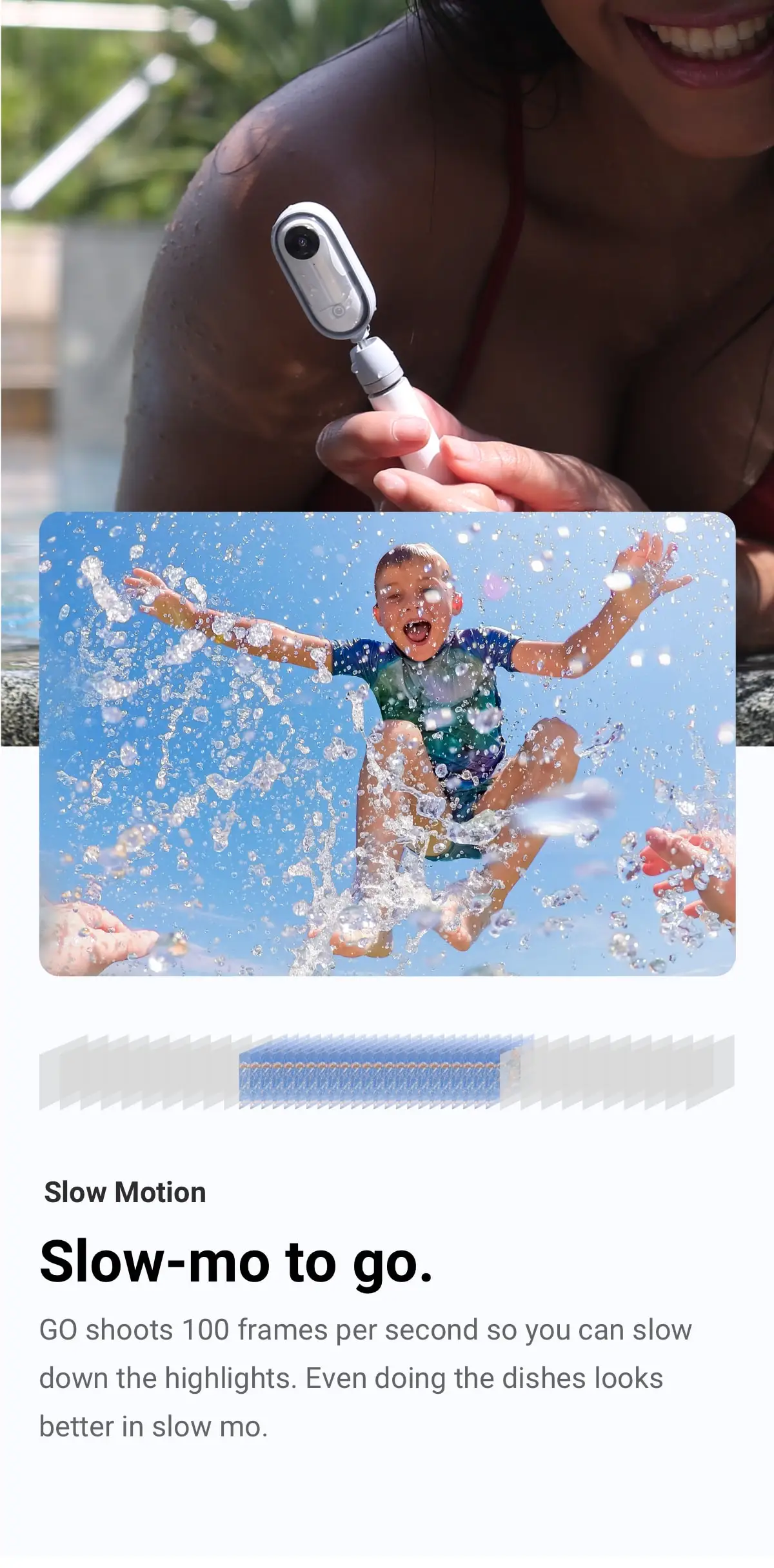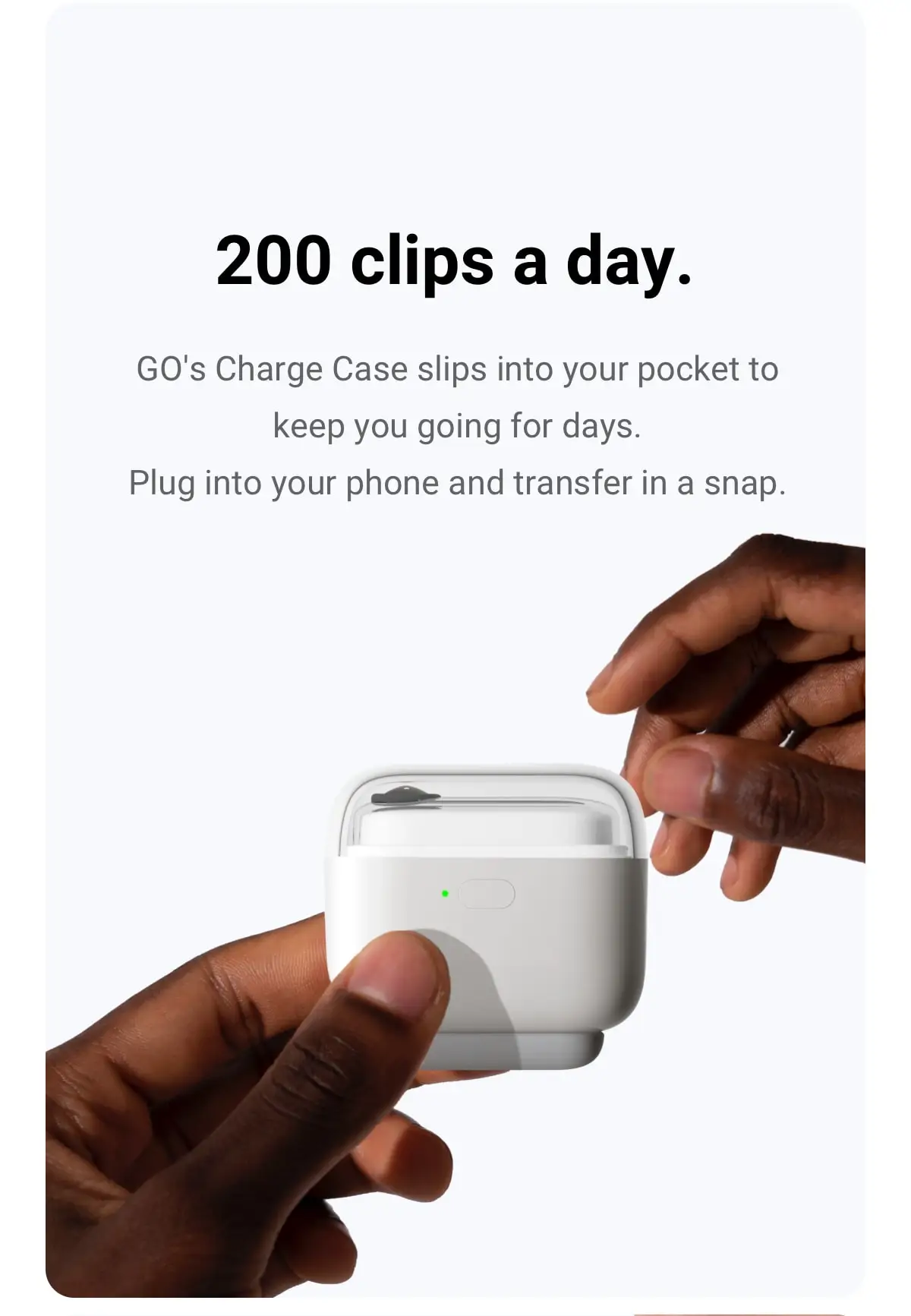 Маленький, но могучий: Go-это Экшн-камера большого размера, которая снимает короткие и острые видео (макс. 1080 P), а затем автоматически изменяет их для вас. GO имеет 4 основные функции (QuickCapture/One Tap/Double Tap/Triple Tap), которые могут быть настроены на ваши предпочтения в приложении.