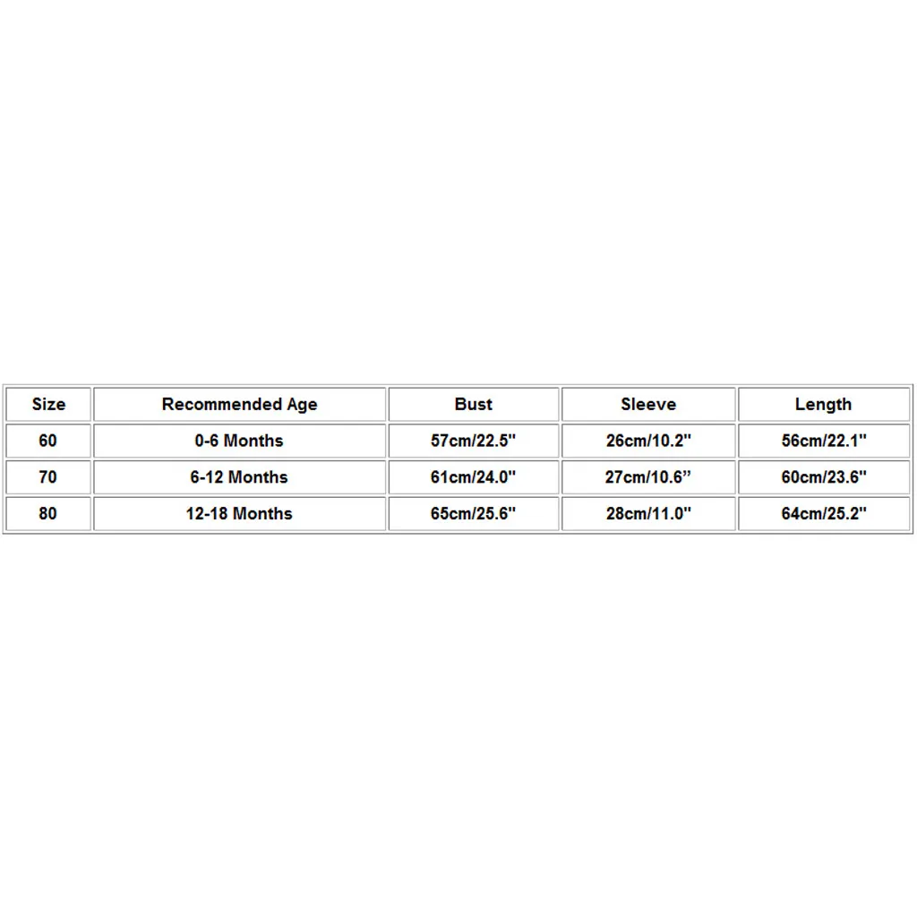 Размеры Рекомендуемый возраст Обхват груди Рукава Длина 60 Для детей от 0 до 6 месяцев 57 см/22,5" 26 см/10,2" 56 см/22,1" 70 6-12 месяцев 61 см/24,0" 27 см/10,6" 60 см/23,6" 80 12-18 месяцев 65 см/25,6" 28 см/11,0" Высота голенища 64 см/25,2"