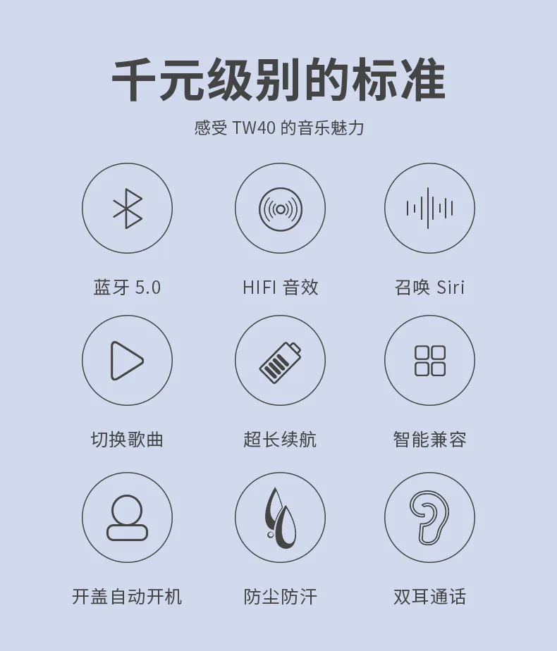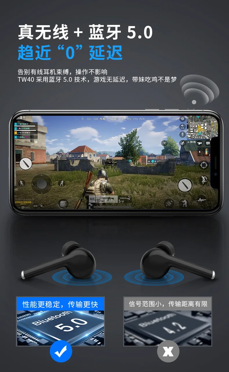 Модель: TW40 Версия Bluetooth: Bluetooth V5.0 Чип Bluetooth: Lanxun/Ruiqi Вход питания: 5 В постоянного тока Емкость источника питания: 3,7 в/50 мАч Время работы: Lanxun (3-4 часа) Ruiqi (5-6 часов) Время зарядки: 1 час Соглашение о поддержке: HFP1.7, HSP 1,2, A2DP 1,3, AVRCP 1,6, SPP 1,2, PBAP 1,0 Чувствительность:-94dBm Частотный диапазон: 20-20000 Гц Сопротивление: 32Ω 1, ботинки После переворачивания зарядного устройства он автоматически включится или вручную нажимает и удерживает в течение 5 секунд, чтобы включить его, и синий свет будет мигать три раза. (Примечание: Если зарядное устройство находится в режиме ожидания в течение длительного времени, это может привести к отключению питания зарядного устройства, но наушники все еще могут использоваться нормально. Просто включите его вручную. Если это произойдет, нажмите и удерживайте кнопку в течение 5 секунд, чтобы включить ее.) 2, выключите После размещения в зарядном отсеке крышка может быть автоматически отключена, или кнопка гарнитуры может быть нажата вручную в течение 5 секунд, чтобы выключить, и красный свет выключения мигает три раза. (Когда устройство не подключено, оно автоматически отключится через 3 минуты) 3 сопряжение по Bluetooth После загрузки он автоматически входит в режим сопряжения. После того, как сопряжение успешно, синий свет левого уха мигает, и мобильный телефон может быть подключен к Bluetooth. После того, как мобильный телефон успешно подключен, свет выключен. Найдите соответствующий Bluetooth имя сопряжения «TW40» из списка телефонов Bluetooth и нажмите на пару подключения. Подключение голосовой подсказки успешно осуществляется примерно за 3 секунды. Если тот же мобильный телефон используется снова, только Загрузочная гарнитура и мобильный телефон автоматически завершат работу соединения сопряжения. Для другого мобильного телефона, мобильный телефон ищет имя сопряжения «TW40» и нажимает соединение. 4, инструкции по зарядке При зарядке отсека индикатор зарядного отсека включен, и после зарядки зарядное отделение всегда включено четыре фары. Когда Гарнитура заряжается, красный свет гарнитуры всегда включен, индикатор отсека для зарядки включен, и полный свет выключен. 5, режим вызова Когда гарнитура включена и подключена к мобильному телефону, нажмите левую и правое наушники, чтобы нажать любую кнопку 2 S, чтобы разбудить Siri, и два наушника работают одновременно. При вызове будет выдан электронный тон + номер вещания, нажмите левую и правильную наушники, чтобы ответить на любую кнопку, нажмите любую кнопку на левой и правой наушниках, чтобы повесить трубку во время звонка, дважды нажмите, чтобы отклонить вызов. 6, определение кнопки: Нажмите: воспроизведение/пауза, ответ/повесить Двойной клик: дважды нажмите на предыдущую композицию, дважды нажмите на следующую композицию Три удара: объем левого уха в три раза, а объем правого уха-в три раза. Пять Хитов: Быстрый тон на английском и английском языках Длительное нажатие в течение 2 секунд: Пробуждение Siri Точка продажи продукта: smart touch, переключатель холла, откидная крышка даже, крышка выключена, сенсорный siri; гарнитура автоматически загружается сопряжение, автоматическая зарядка на склад; Чистая кобальтовая батарея с защитной платой, магнитная контактная зарядка, настоящий медный вес кольца бас, HD бинауральный вызов