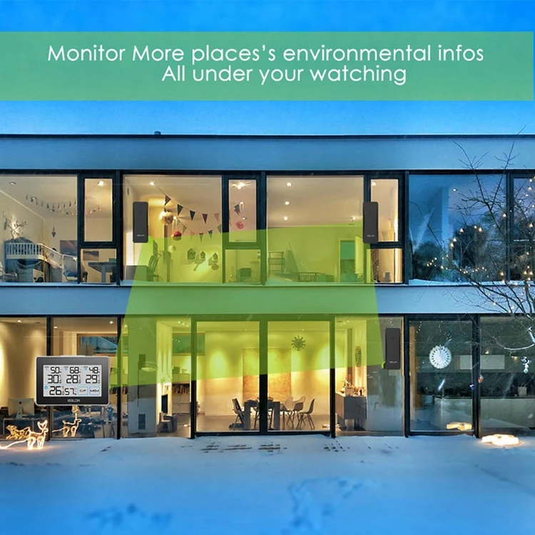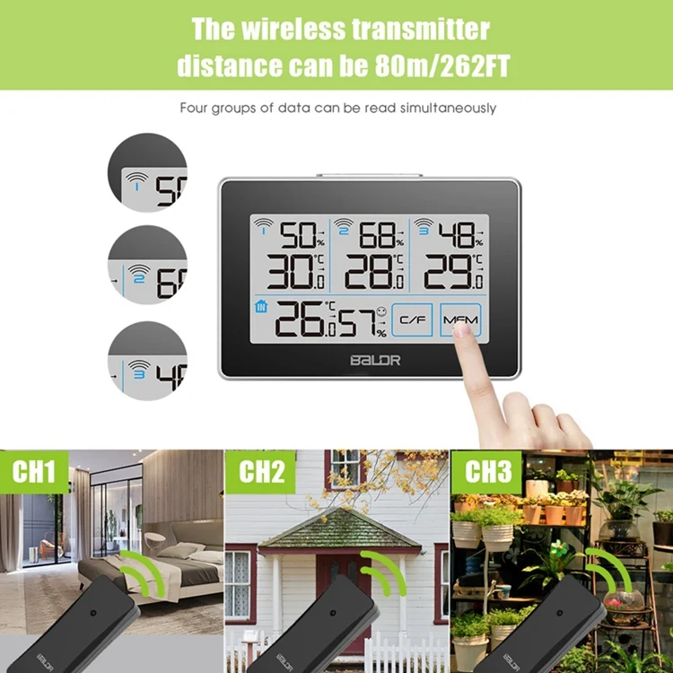 Лаконичный Дизайн ЖК-дисплея обеспечивает Четкий просмотр Две сенсорные кнопки на экране для быстрой работы Четыре группы температуры и влажности можно читать только на вашем месте Индикатор уровня комфорта, чтобы напомнить вам о состоянии влажности в помещении Многозонное управление качеством температуры и влажности с 3 дистанционными датчиками Тренды стрелок показывают тенденции каждой температуры и влажности Макс/мин записывает все температуры и влажности в течение 24 часов Белая подсветка может быть активирована для 20s нажатием верхней кнопки