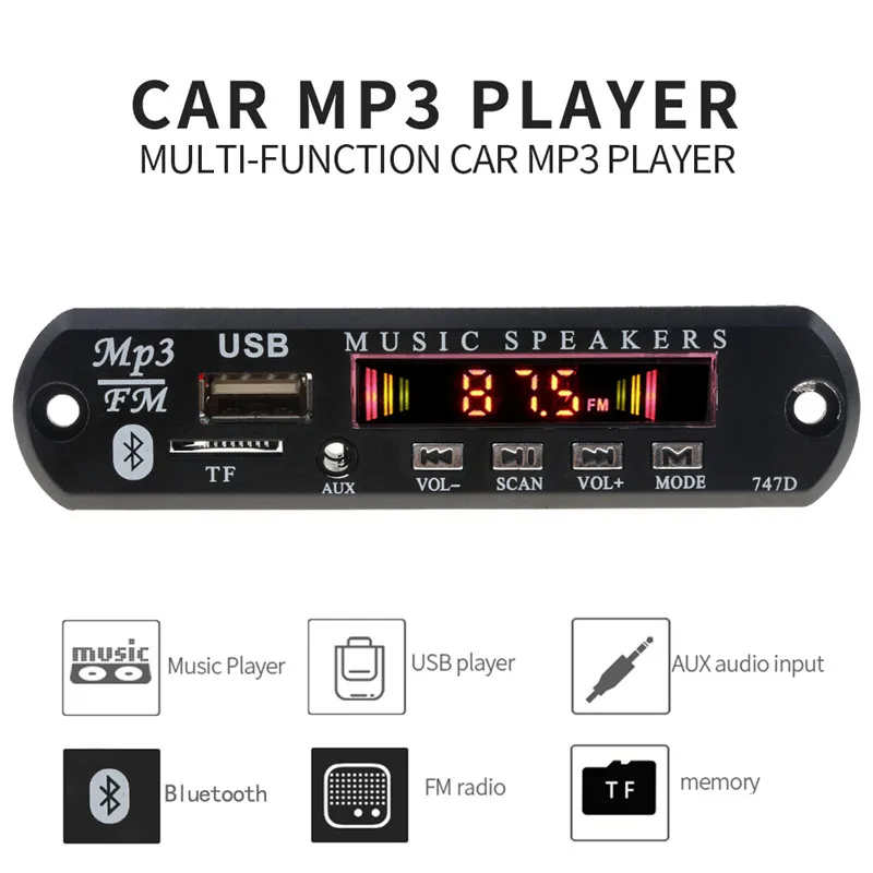 Особенность: * Поддержка переключения сигнала напрямую. Поддержка USB, TF * Поддержка bluetooth (bluetooth 3,0 EDR) (После сопряжения с мобильными телефонами можно воспроизвести беспроводную музыку)* Поддержка USB / TF / Bluetooth/FM/линейный переключатель. MP3 / WMA, WAV чип декодирования музыки без потерь.* Поддержка переключателя USB / TF-карт, PREV, NEXT, fast forward, быстрая перемотка, громкость, EQ, воспроизведение/пауза, остановка, одиночный повтор, отключение звука, выключение и прямые выборы.* Поддержка Bluetooth PREV, NEXT, volume, EQ, воспроизведение/пауза, отключение звука, выключение.* Поддержка файловой системы FAT16, FAT32. Поддержка MP1 Layer3, MP2 Layer3, MP3 Layer3 версии песни. Поддержка 32-320 кбит/с MP3 песен.* Поддержка функции отключения питания: память воспроизводит песни и громкость перед выключением питания.Примечание:Неумные телефоны (android) должны ввести пароль-0000Инструкция по режиму воспроизведения платы декодирования:Плата декодирования при отсутствии карты памяти или U-диска, загрузка по умолчанию в/'/'аудио вход/' режим, линия отображения экранаНажмите/'/'MODE/' на панели или пульте дистанционного управления переключиться в режим bluetooth, экран показывает/'/'BLUE/', на данный момент можно открыть соединение поиска по bluetoothНажмите/'/'MODE/' на панели или пульте дистанционного управления переключиться в режим радио, экран отображает FM-радио частоту, длительное нажатие/'Воспроизведение/' кнопка автоматического поиска каналаНажмите/'/'MODE/' на панели или переключите пульт дистанционного управления на U-диск или карту памяти/'/'play MODE/', на экране отображается график песниИнструкция по дистанционному управлению:1. Питание: кнопка ожидания не может переключаться.2. Режим: TF карта и U диск: последовательность переключения для usb→ tf→ bluetooth→ fm→ AUX;Только U диск: последовательность переключения для usb→ bluetooth→ fm→ AUX;Только TF-карта: последовательность переключения для tf→ bluetooth→ fm→ AUX;Нет USB и TF-карты: последовательность переключения для fm→ AUX → Bluetooth.3. PREV: в режиме USB/TF / Bluetooth короткое нажатие для PREV;В режиме USB / SD Длительное нажатие для быстрого перемотки; В режиме FM короткое нажатие для последнего канала, длительное нажатие для поиска скана последнего канала.Далее: в режиме USB / TF/Bluetooth короткое нажатие для следующего;В режиме USB / TF Длительное нажатие для быстрого вперед;В режиме FM короткое нажатие для следующего канала, длительное нажатие для поиска следующего канала.4. Громкость +: Короткое/Длительное нажатие для музыки. Громкость-: Короткое/Длительное нажатие для музыки.5. REP: в режиме USB / TF переключается между одним повтором и целым циклом при воспроизведении музыки, загружается для всех циклов.6. Остановка: в режиме USB / TF короткое нажатие для остановки воспроизведения музыки.7. Отключение звука: Отключение звука, нажмите для отключения звука, нажмите еще раз для отключения звука (также можно отключить громкость/Громкость +).8. EQ: режим акустического поля. NORMAL→BAS→POP→ROC→JAZZ→CLA→CUT→NORMAL9. Воспроизведение/пауза: в режиме USB/SD/Bluetooth для воспроизведения/паузы; В режиме FM Длительное нажатие для поиска всех каналов и сохранения.Спецификация:Шаг установки: ширина 92 ммУстановочное отверстие: 83x20x38 ммГабаритные размеры: 107x25x38 мм(Ш x В x Г)Входное напряжение: 5-12 ВПосылка входит: