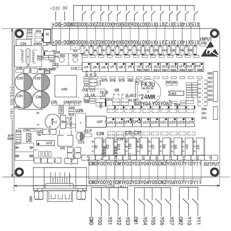 X входные элементы DC24, X0-X27 вход, низкий уровень X0-5-это высокоскоростной входной порт подсчета (по умолчанию 12K, 100 кГц опционально)
