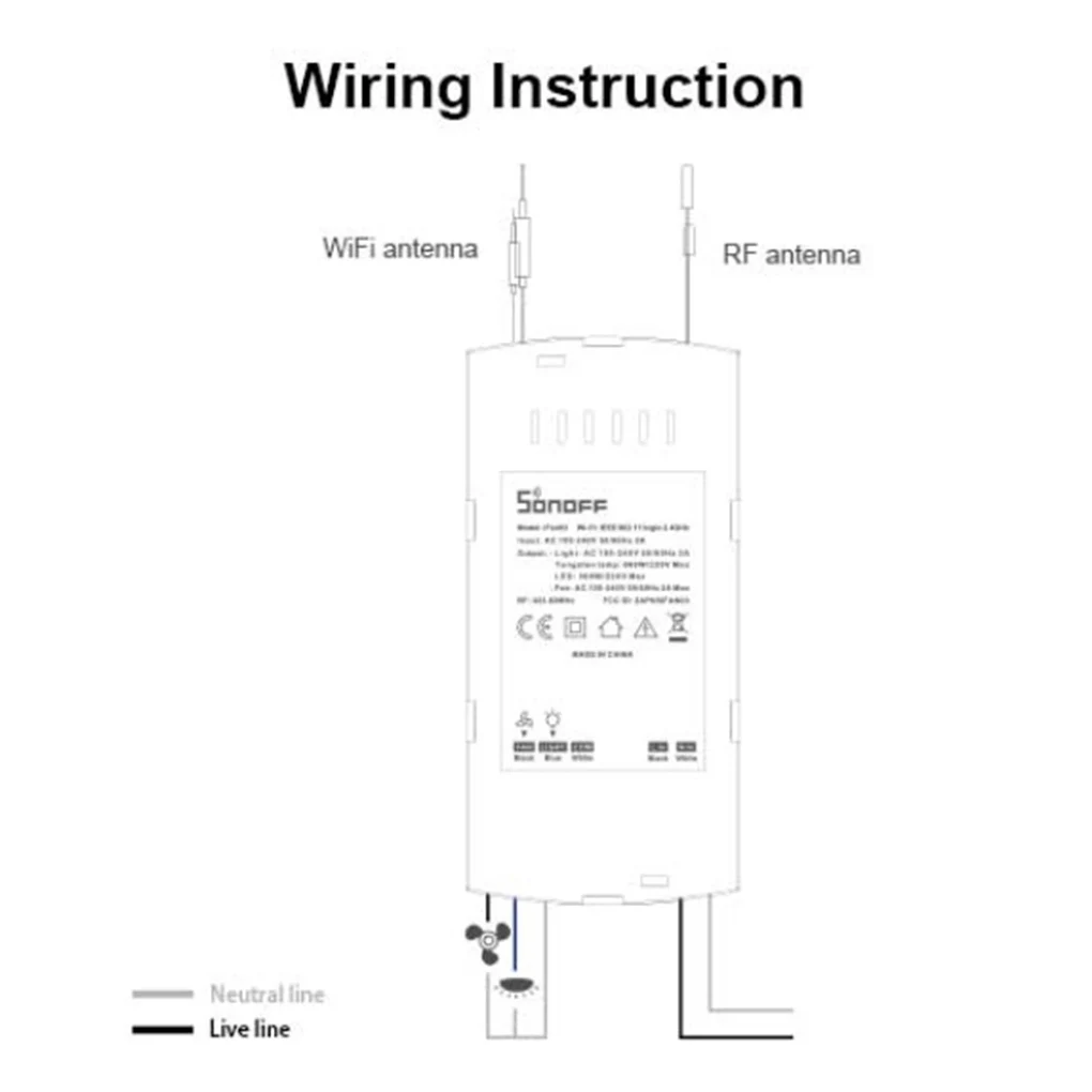 SONOFF iFan03 поставляется с пультом дистанционного управления 433 RF, с которым вы можете включить/выключить вентилятор и свет, регулировать скорость вентилятора в помещении.