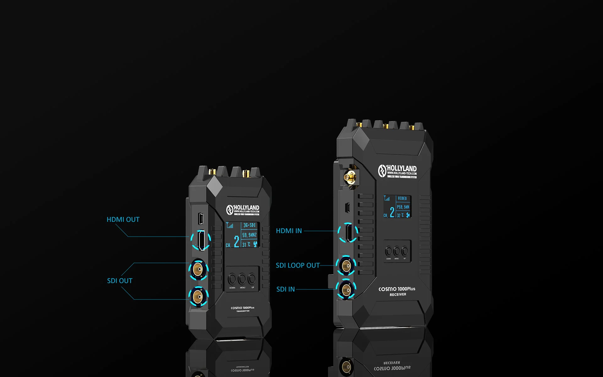 Hollyland Cosmo 1000Plus позволяет передавать сигнал HDMI/SDI до 1000 'линии зрения на HDMI или два SDI выхода. Набор передатчика/приемника поддерживает до 1080p60 сигналов с задержкой <1 мс. Передатчик предлагает один HDMI и один вход SDI, 3,5 мм стерео аудио вход переменного тока, и один SDI loop-через выход. Приемник предлагает два SDI и один HDMI выход.