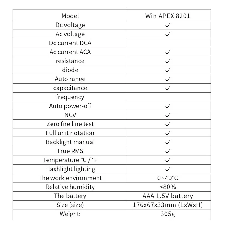 1x winapex 8201 мультиметр 2x Тесты провода 1x Руководство пользователя 1x Розничная коробка