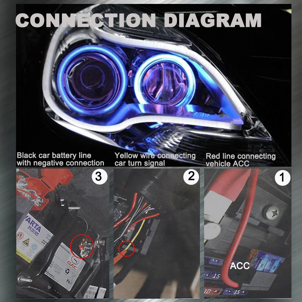 Простая установка-просто соединяйте в текущий DRL и проводку сигнала поворота, просто требуется правильное подключение к положительной (+) и отрицательной (-) стороне, красный кабель подключается к беговому кабелю (белый светильник), желтый кабель подключается к токарному кабелю (поток янтарного цвета), черный кабель подключается к отрицательному аккумулятору.