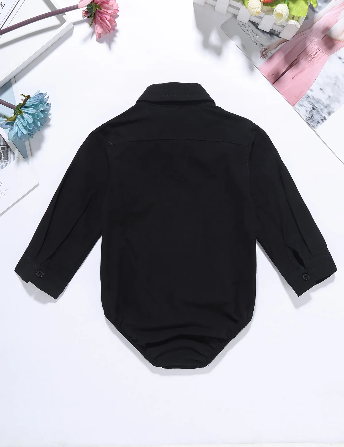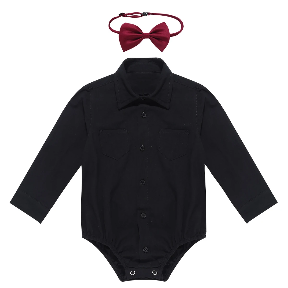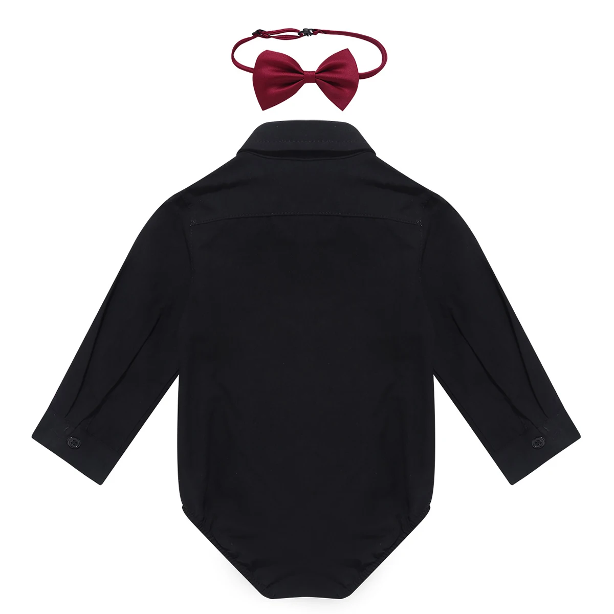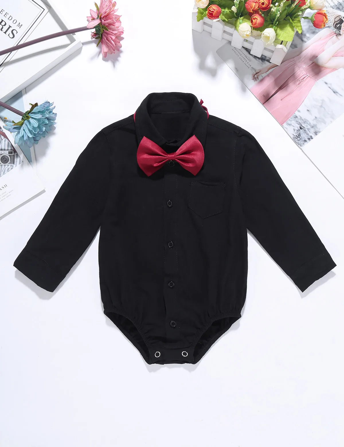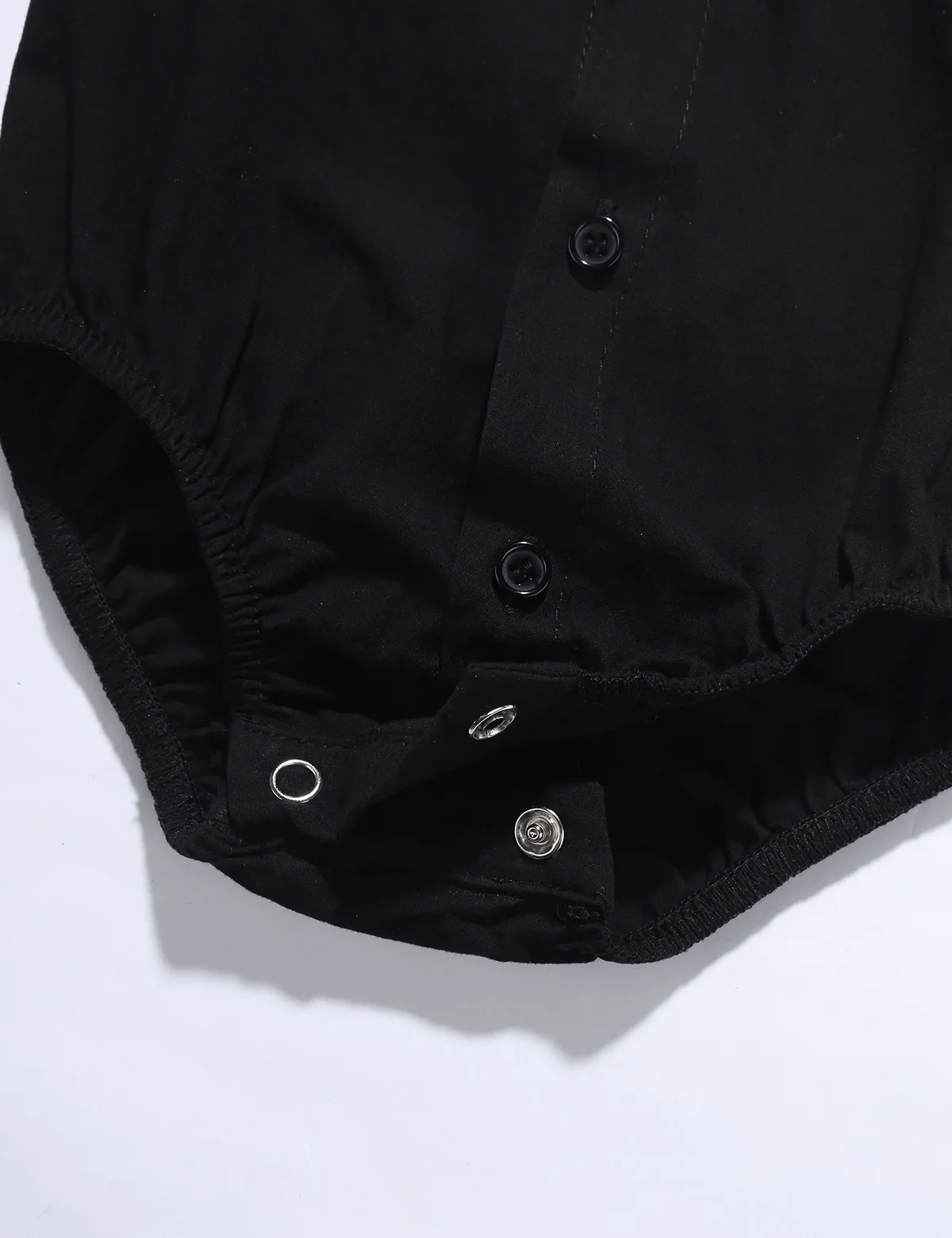 Эластичные отверстия для ног, застежки внизу для легкой смены подгузников. Регулируемый черный галстук-бабочка с застежкой.