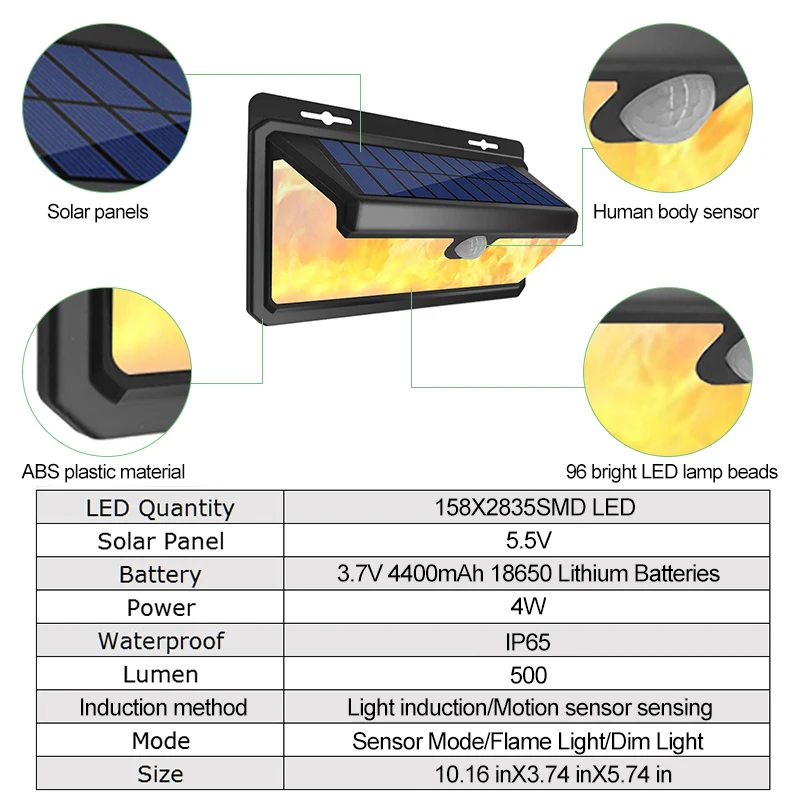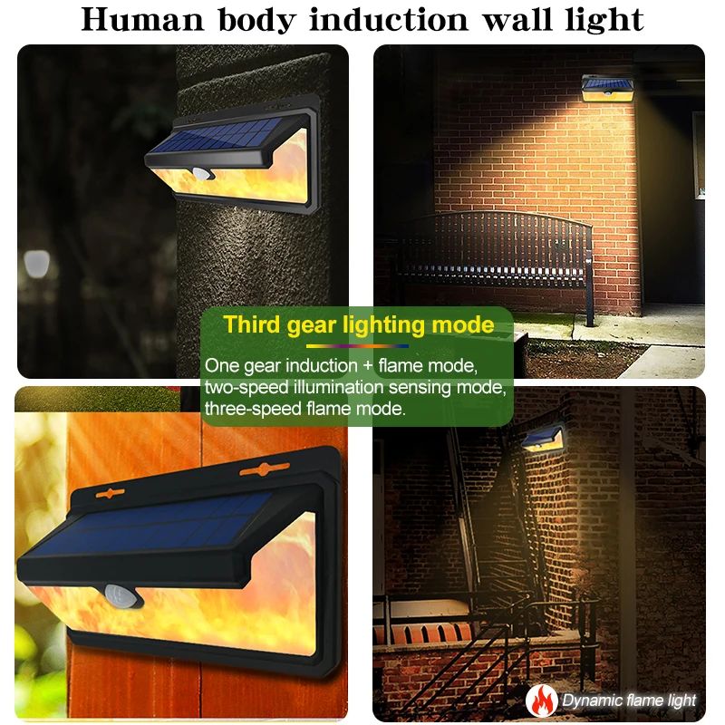 -- Спорт на открытом воздухе светильник имеет три режима работы и два светильник режимов (белый светильник и пламя светильник режим), которая может подстраиваться под различных сценариев использования. Уникальный режим "светильник пламени" поддерживает режим чувствительного датчика движения, имитирующий естественное пламя вспышки. -- Солнечные огни безопасности с 158 модернизированными светодиодами высокой мощности обеспечивают превосходное освещение и широкий диапазон освещения до 270 градусов. В ночное время или в темных местах, когда датчик обнаруживает движение, светильник автоматически подсвечивается в течение 30 секунд, и если при обнаружении движения во время работы светильник будет расширен. -- Солнечные водонепроницаемые Настенные светильники могут выдерживать экстремальные погодные условия. Подходит для наружных патио, садов, палуб, дворов, наружных стен, заборов и т. Д. -Светодиодный светильник имеет батарею емкостью 4400 мАч, которая может хранить больше солнечной энергии, обеспечивая длительную работу и продлевая срок службы батареи. Дополнительная проводка не требуется для обеспечения безопасности освещения. Безопасный и экологически чистый. Супер яркий Солнечный настенный светильник с датчиком движения 1. Перед использованием в первый раз, пожалуйста, зарядите светодиодную лампу на солнце в течение 6-8 часов, чтобы обеспечить эффект; 2. Время освещения зависит от эффективного солнечного времени в течение дня; 3. Садовый светильник на солнечной батарее автоматически переключает режим зарядки в дневное время, и автоматически включается светильник при обнаружении движения человеческого тела в ночное время, без дополнительной проводки, энергосбережения и охраны окружающей среды; 4. Два режима освещения, три режима работы, может полностью удовлетворить ваши различные потребности сцены, и есть режим, чтобы служить вам в любое время; Будьте внимательны: 1. Пожалуйста, установите на открытом воздухе поверхность светодиодный солнечный светильник для того, чтобы убедиться, что солнечная панель может непосредственно прикосновение солнца светильник без какого-либо чехла или стекло. 2. Для лучшей производительности аккумулятора, полностью зарядите аккумулятор в течение 2 или 3 дней, прежде чем включить его в первый раз. Подсказка: Зимой, солнечный светильник s должен быть полностью заряжен из-за недостатка светильник. Поэтому, если солнечный свет не достаточно яркий, время освещения короткое, и время освещения нормальное, в зависимости от количества заряда в течение дня.