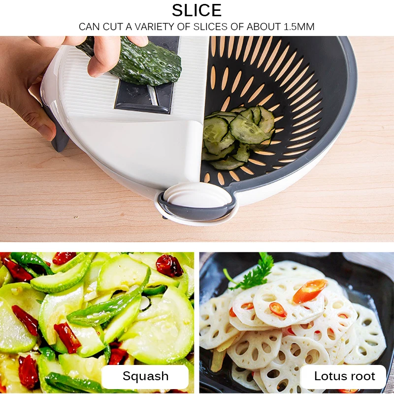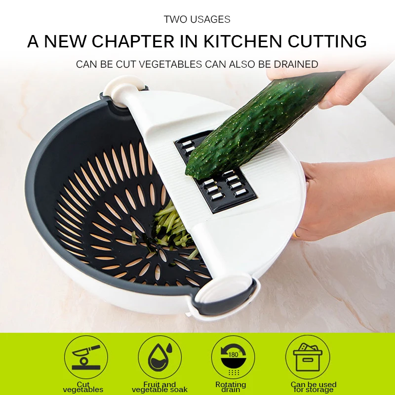 Резка и очистка, простая и быстрая, вращающаяся Пряжка, автоматический угол поворота, корзина для битума всегда стабильна, легко моется за овощи и сливается.