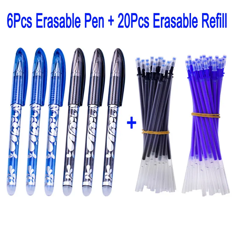 DELVTCH 0.5mm 6+20Pcs/Set Erasable Gel Pen Erasable Pen Refill Rod Blue Black Erasable Ink School Stationery Office Writing Tool
