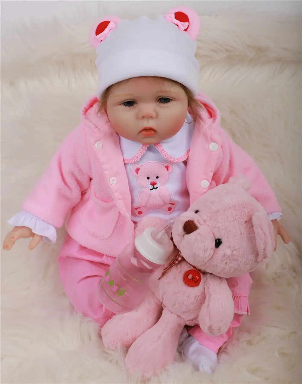 Описание изделия цвет кожи: белая кукла размер: 22 дюйма, 56 см вес: вес нетто куклы составляет около 1,4 кг, материал и структура: Силиконовая виниловая кукла всего тела, мягкое прикосновение и реалистичность, гибкий. Куклу можно положить в воду для ванны или душа. Кукла полностью удобна, голова и конечности могут свободно перемещаться. Глаза: высококачественные прозрачные акриловые глаза, глаза не могут мигать волосы: нанесенный вручную высокотемпературный синтетический парик, очень мягкий на ощупь, волосы могут быть повреждены или выпрямлены утюгом для волос, jsut убедитесь, что температура не превышает 120 ° по Цельсию. Одежда: платье будет точно таким же, как на картинке. Вы можете изменить одежду для нее самостоятельно, размер одежды для ребенка 0-3 м подходит для нее, вы получите одежду куклы, как показано на картинке, соски + бутылочку для кормления + сертификат