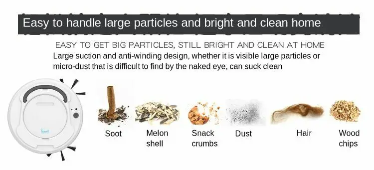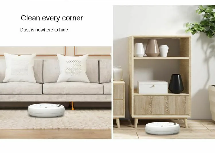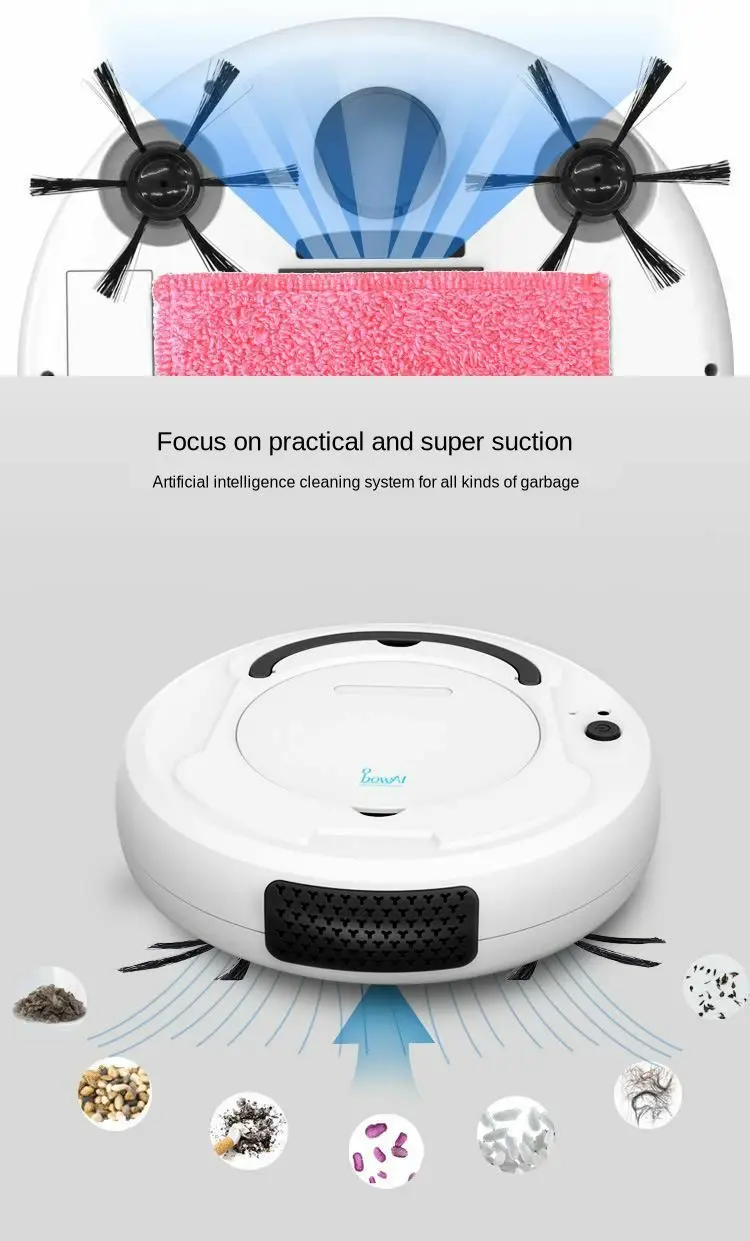 Функция: один ключ запуска, подметать пол, шваброй пол, пылесос, зарядка через USB, универсальное направление вождения, автоматические авиационные препятствия, продвинутая мода, низкий уровень шума, единодушие не повторяются, низкая награда, высокое освещение