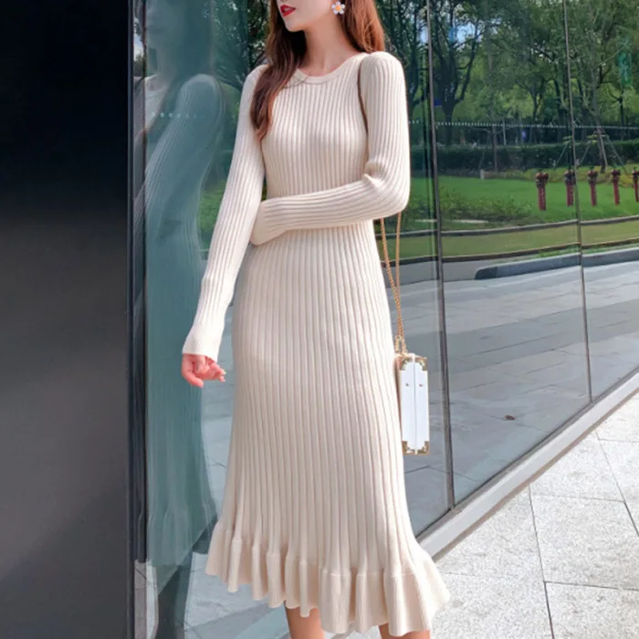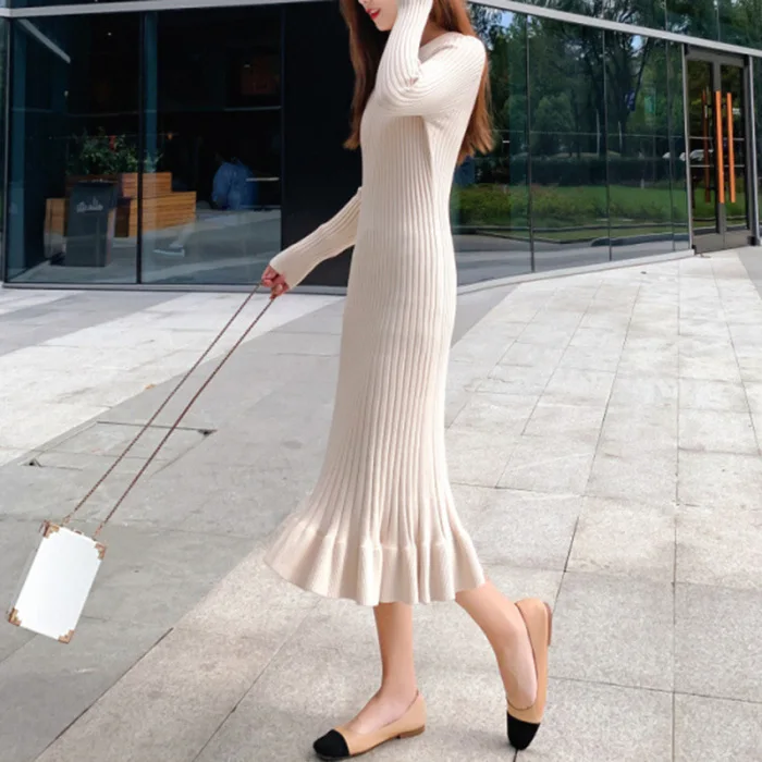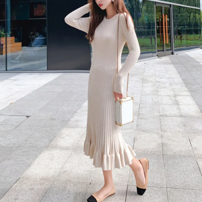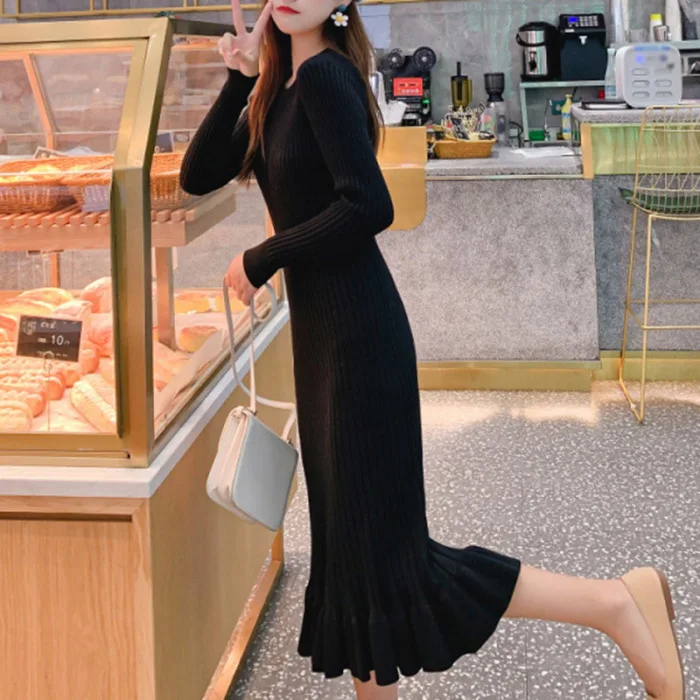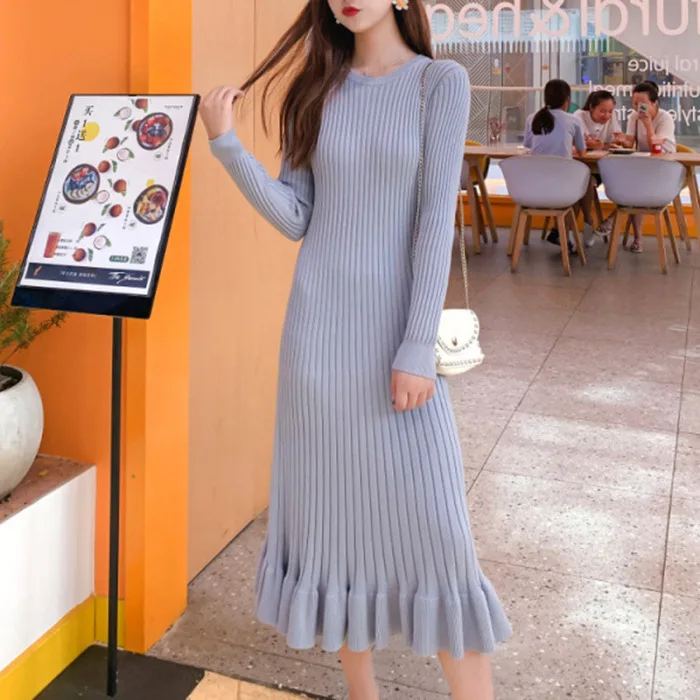 Для женщин Леди с длинным рукавом сплошной цвет круглый воротник рыбий хвост платье для осень зима MUG88