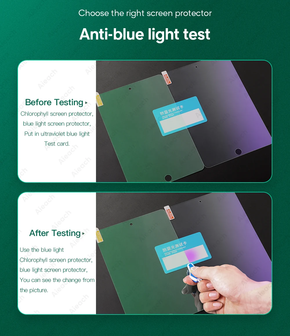 Защитная пленка для хлорфилла/Защита для экрана против синего света была протестирована одновременно. Как вы можете видеть на фото, только защита экрана хлорфилла не заразится синими лучами.