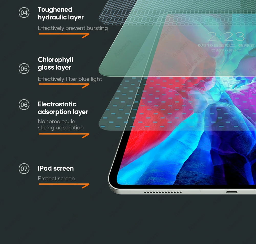 ①-Наноолеофобный слой Эффективная защита от отпечатков пальцев ②-Высокопроницаемый стеклянный слой Прочный и устойчивый к царапинам ③-Слой из мягкого волокна Повышенная устойчивость к внешнему давлению ④-Усиленный гидравлический слой Эффективно предотвращает появление разрыва ⑤-Слой из хлорфилла Эффективно фильтрующий синий светильник Electrostatic-электростатический адсорбционный слой Nanomolecule Высокая поглотительная способность