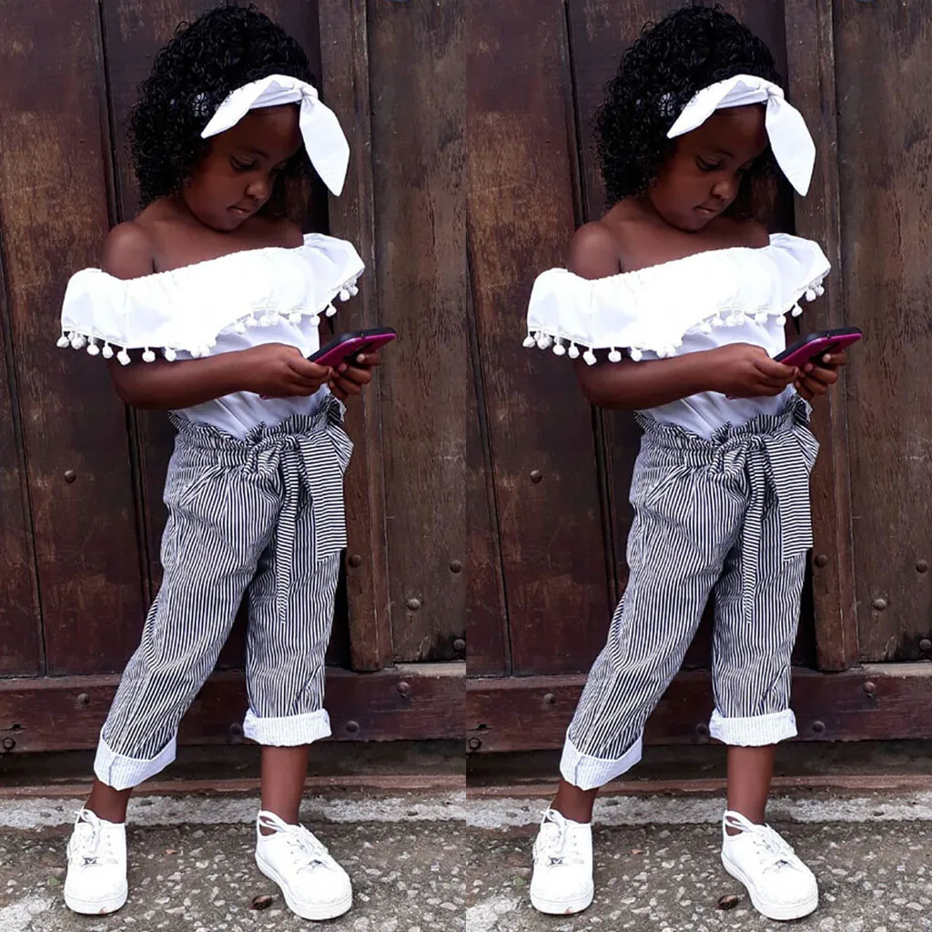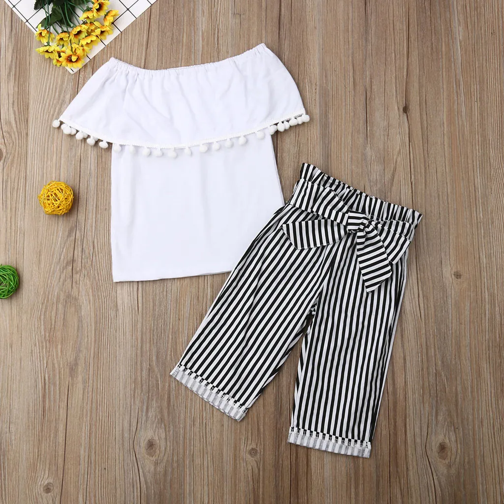 Одежда для детей и малышей, для девочек, с открытыми плечами, с кисточками, топы штаны в полоску, комплект одежды