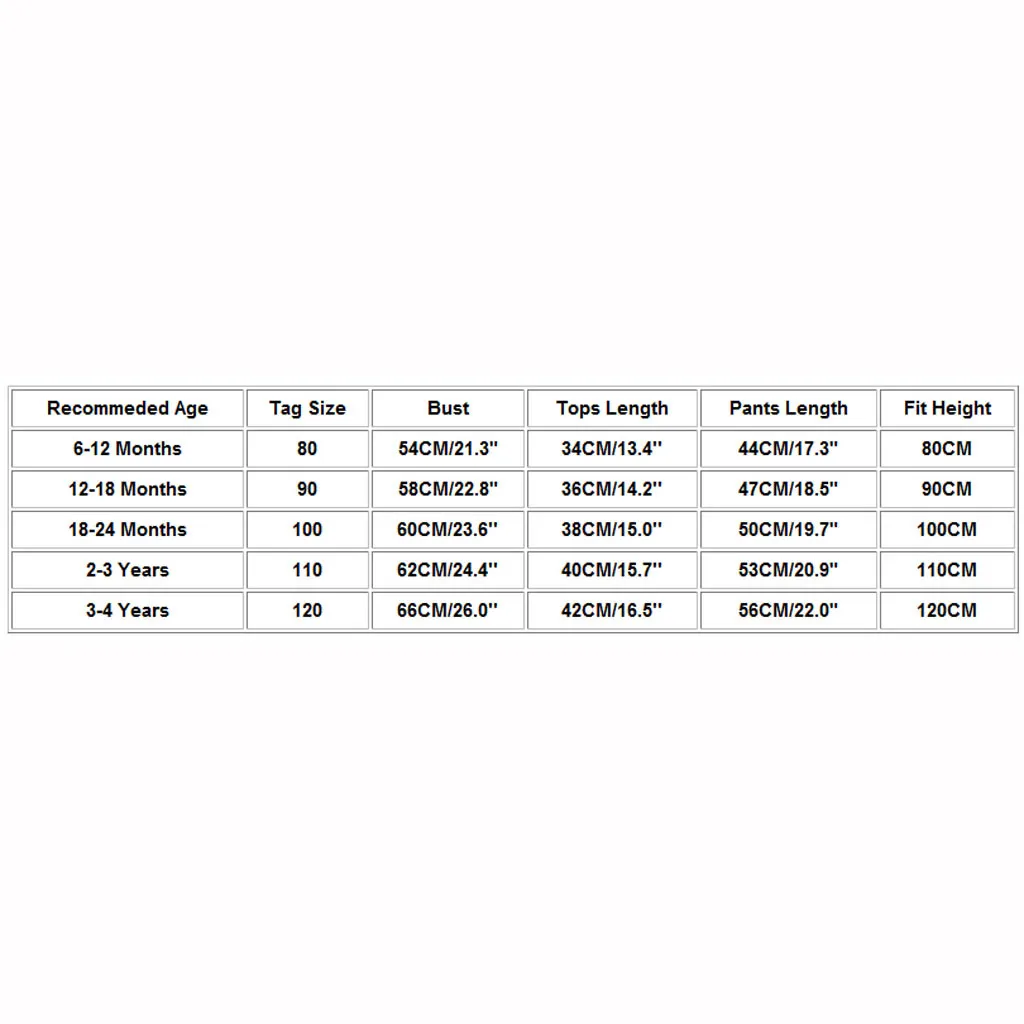 Рекомендуемый возраст Тег Размеры Обхват груди Топы Длина Брюки Длина Подходит для роста 6-12 месяцев 80 54 см/21,3" 34 см/13,4'' 44 см/17,3" 80 см 12-18 месяцев 90 58 см/22,8" 36 см/14,2'' 47 см/18,5" 90 см 18-24 месяцев 100 60 см/23,6'' 38 см/15,0'' 50 см/19,7" 100 см От 2 до 3 лет 110 62 см/24,4'' 40 см/15,7'' 53 см/20,9" 110 см От 3 до 4 лет 120 66 см/26,0'' 42 см/16,5'' 56 см/22,0" 120 см