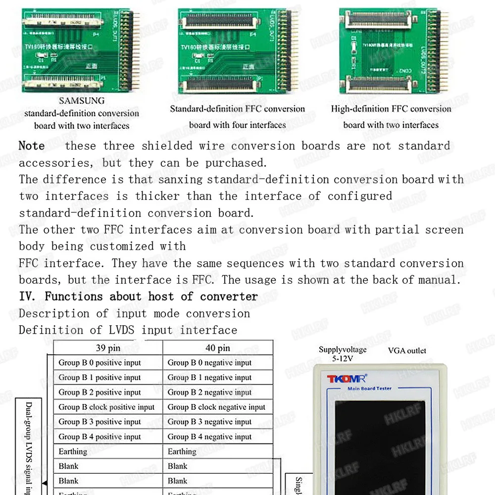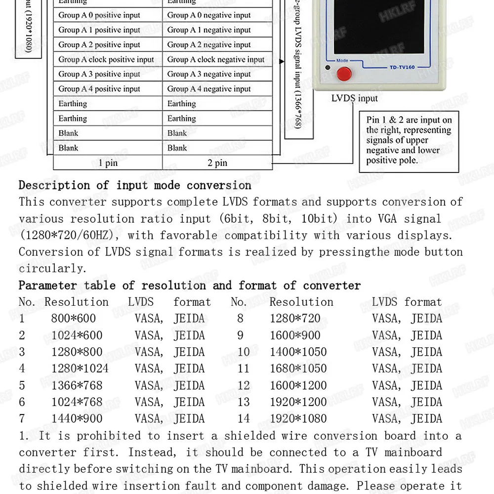 1. По сравнению с 6-го поколения, преобразователь 7-го поколения имеет сильную совместимость и поддерживает полноэкранный дисплей всех материнских плат 4K TV, в настоящее время на рынке, В то время как 6-е поколение не может отображать 4K телевизор на весь экран;2. Кроме того, 7th поколения оснащен 7-дюймовый дисплей высокой четкости, изображение более четкое, герои понятны в заводском режиме, И символы 6-го поколения не ясны в заводском режиме!3. Преобразователь 7-го поколения принимает мощный процессор A7, который имеет более широкие функции и более совместим, чем 6-е поколение!Технические характеристики:Руководство преобразователя LVDS-VGA 6-го поколения (прилагается с устройством)Спасибо за выбор преобразователя LVDS-VGA 6-го поколения (версия экрана дисплея)Разработано TD, пожалуйста, внимательно прочитайте это руководство перед использованием. Во время LCTVТехническое обслуживание и производство, материнская плата должна быть подключена к экрану для тестирования;Тем не менее, из-за различных спецификаций материнской платы, различные экраны требуются дляТехническое обслуживание или производства. В этом случае это преобразование разработано для снижения давленияВручную установленный экран и предотвращает повреждение экрана, вызванное выходным сигналом материнской платыВина, которая приводит к большим потерям. С учетом этого этот конвертер способенОтображение LVDS непосредственно с материнской платы или преобразование в VGA для вывода. Кроме того, он можетБыть подключен к дисплейному экрану для обслуживания и ввода в эксплуатацию.Для тестирования материнской платы, чем 32 LVDS сигналов, поставляется с дисплеем. После того, как хост сначала включил питание, а затем используйте оригинальную линию экрана машины, затем соответствующий адаптер пластины, в случае короткого замыкания платы не дали плате адаптер питания пластины, И затем вставляется в адаптер пластины конвертера на хосте, На этот раз вы сможете разместить на дисплее изображение выходной платы.Характеристики данной конверсионной платы1. Оснащен экраном 4,3 ", он может отображать LVDS изображение непосредственно сМатеринская плата, Поддержка внешнего VGA.2. Он поддерживает Сигнал LVDS с различными коэффициентами разрешения (60 Гц, 120 Гц и 240 Гц) одного илиДвойной экранированный провод.3. Он выдает равномерный сигнал VGA (1280*720/60 Гц), который может быть подключен к различнымДисплей, поддержка CRT, жидкокристаллический и ТВ-дисплей (благоприятная Совместимость).4. Входной интерфейс имеет антистатический дизайн с лучшей антистатической емкостью.5. Удобное преобразование между различными форматами LVDS.6. Широкий входной мощности, с адаптером 5V-12V.